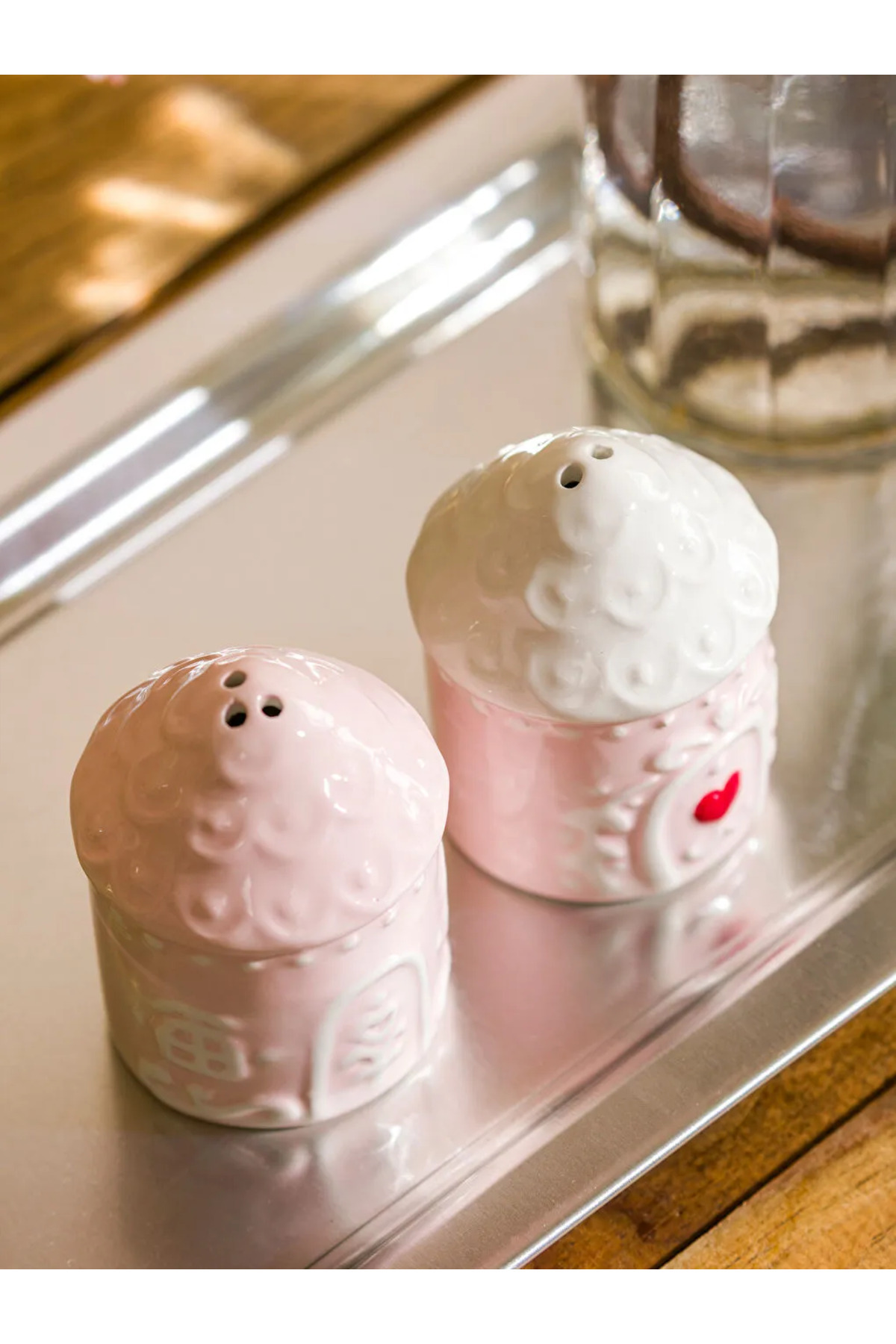Kurabiye ev şeklinde tasarlanmış, kabartma desenli ve kalp detaylı tuzluk biberlik seti, seramik malzemeden üretilmiştir.