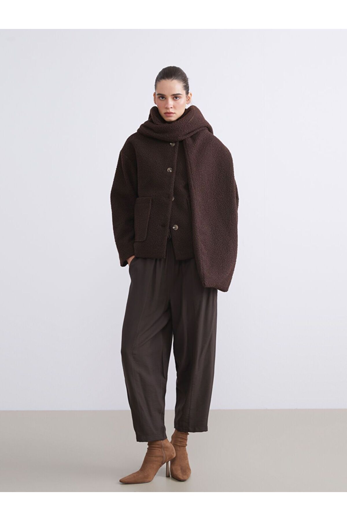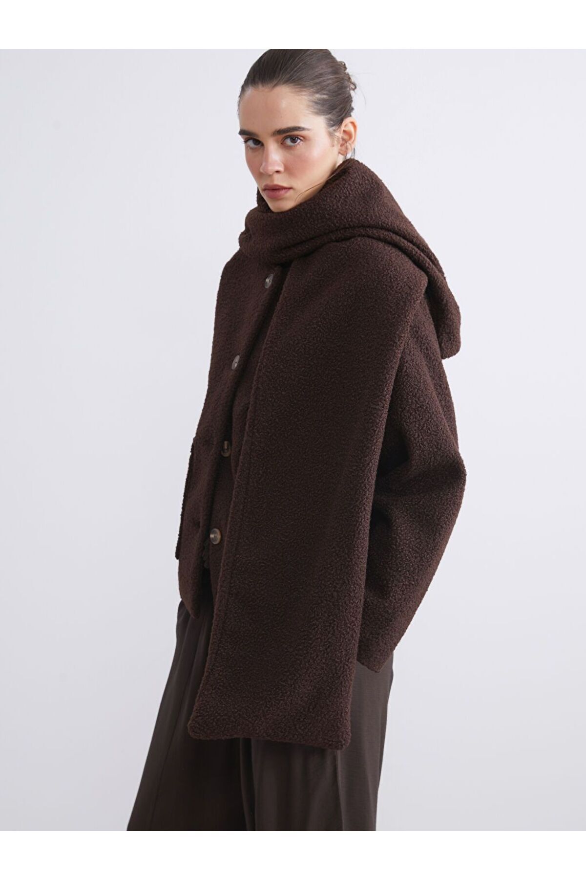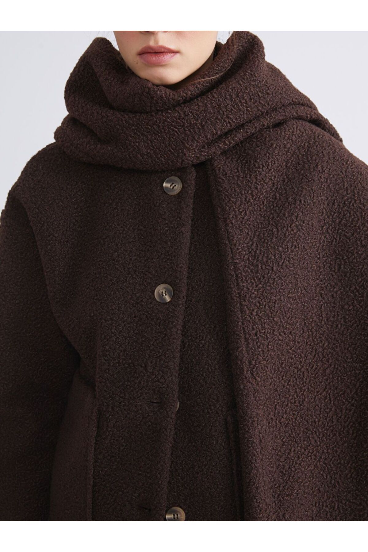 Ürün AçıklamasıAtkı detaylı yüksek yakalı kadın kaban, uzun kollu ve önü çift ceplidir.