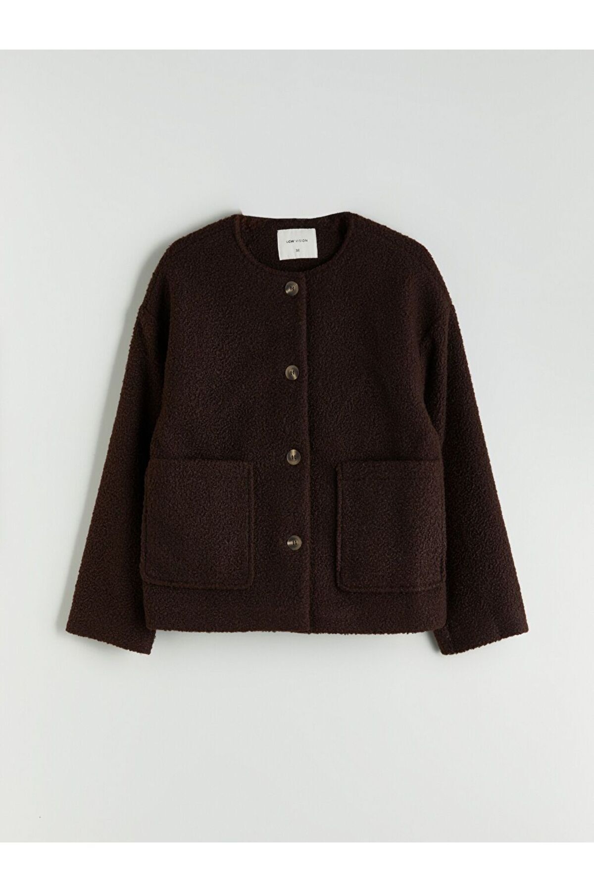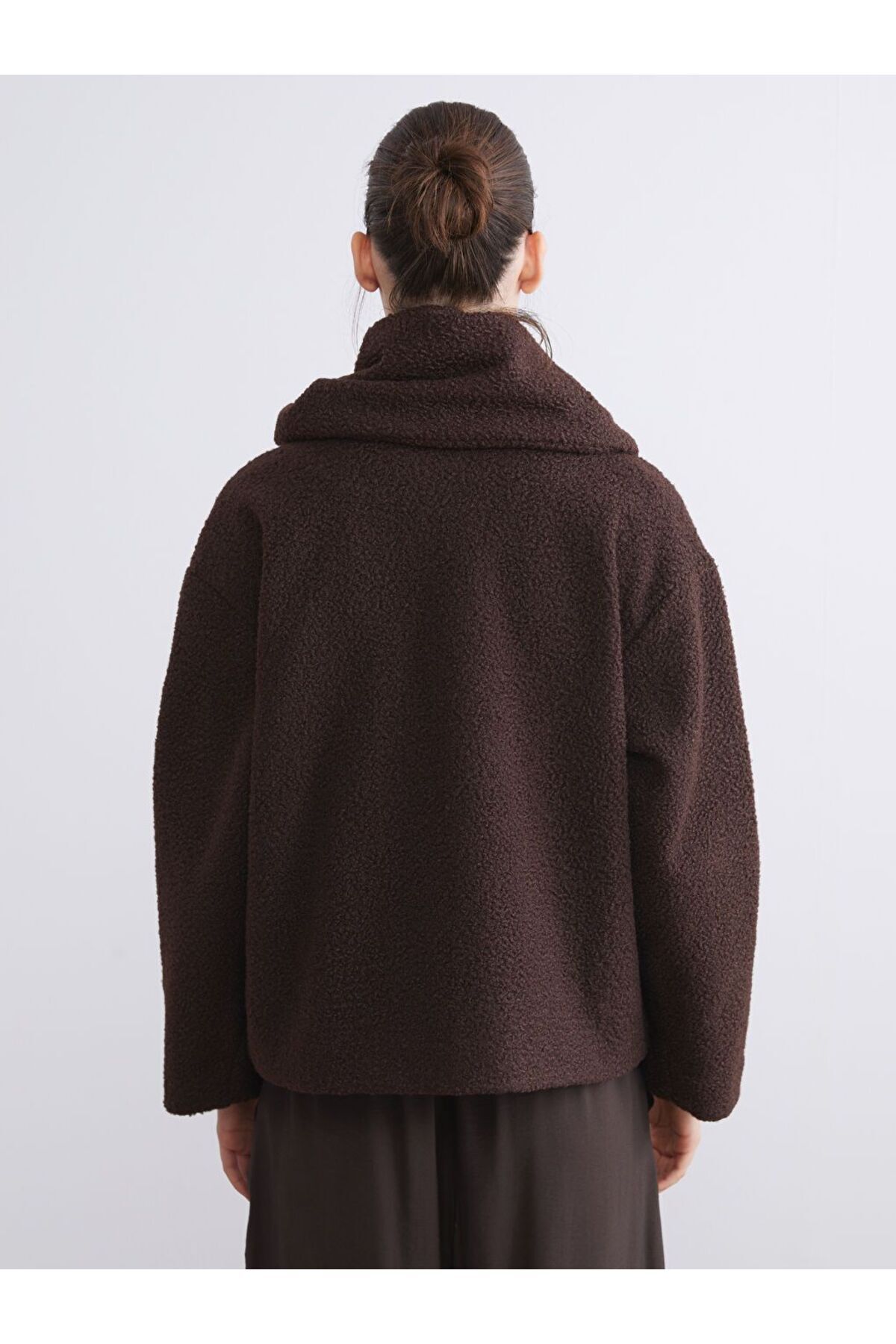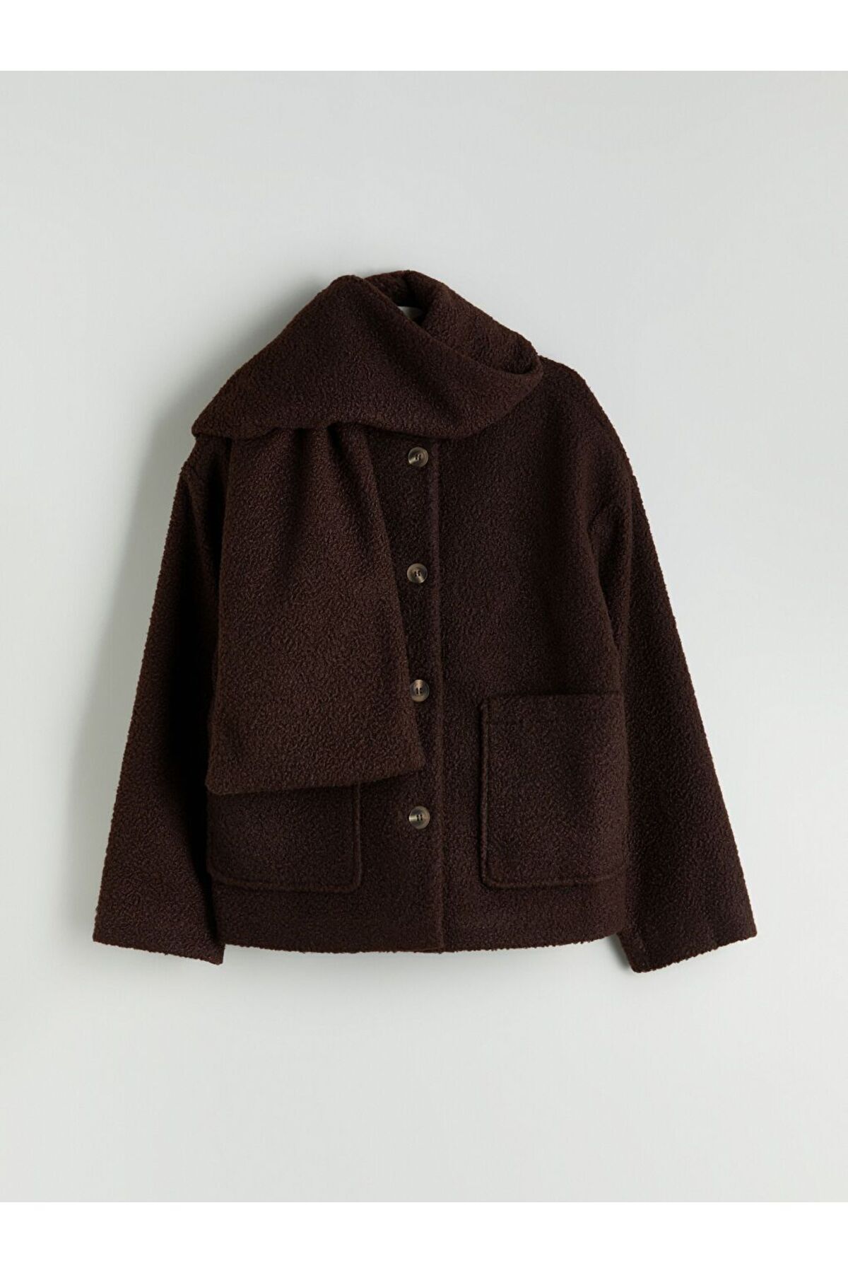 Ürün AçıklamasıAtkı detaylı yüksek yakalı kadın kaban, uzun kollu ve önü çift ceplidir.