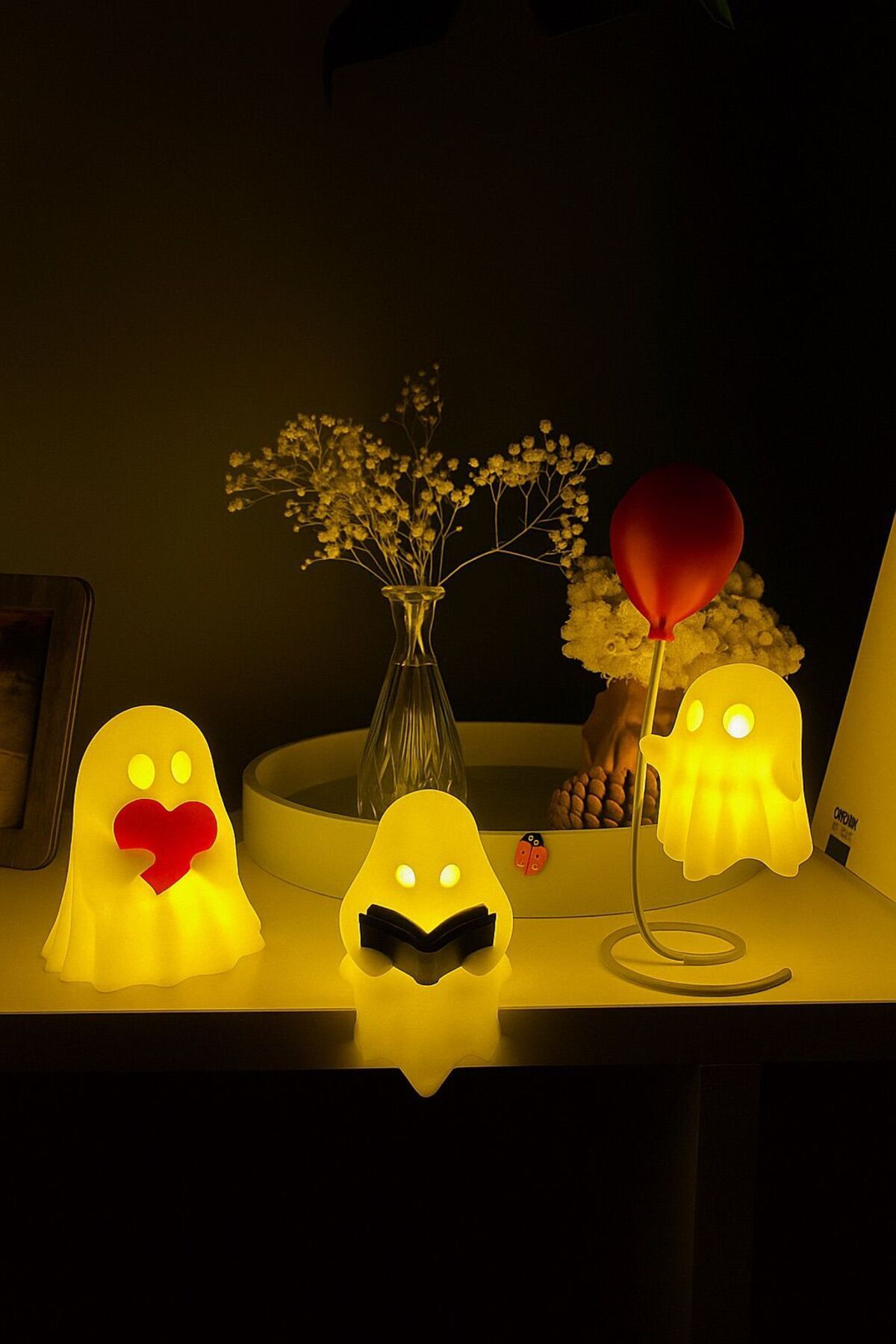 Her biri farklı bir karakteri yansıtır: 💛 Kalpli Hayalet – Sevgi dolu bir görünüm sunar, romantik dekorlarda harika durur.