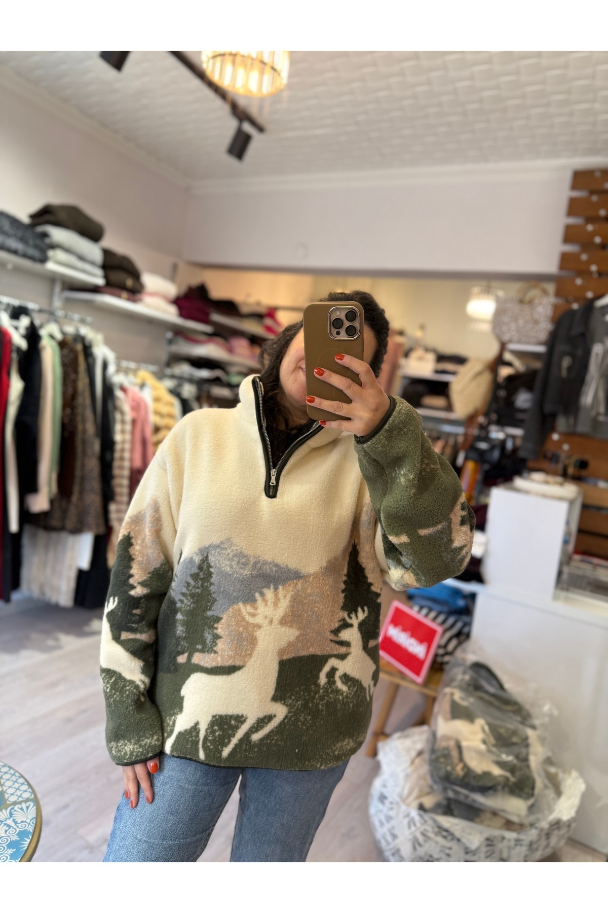 Geyik Desenli Polar Sweatshirt
