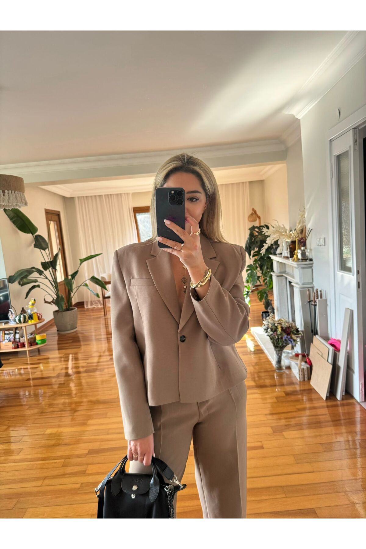 Kadın kahverengi blazer pantolon takım