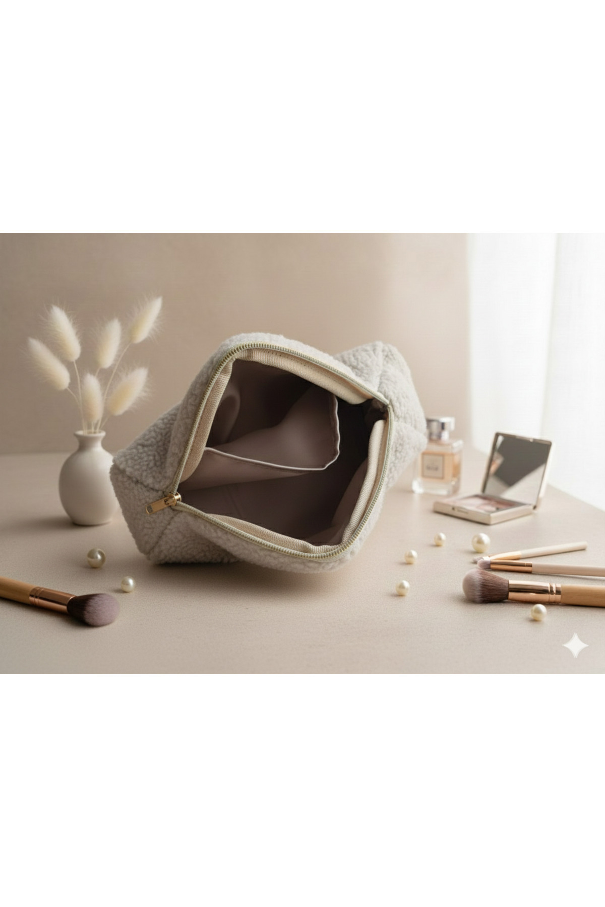 - Yumuşak ve dayanıklı teedy kumaştan yapılmış olup, makyaj malzemelerinizi korurken şık bir görünüm sağlar.