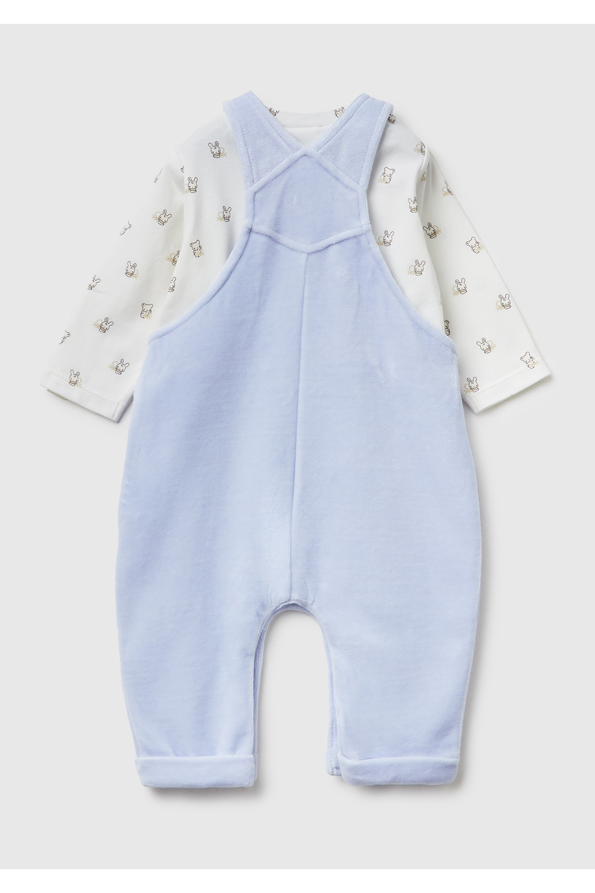 Bebek Ekru-Mavi Desenli Uzun Kollu T-shirt ve Tavşan İşlemeli Salopet Takım