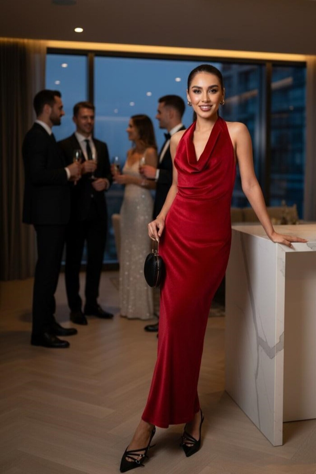 Kırmızı Kadife Sırt Dekolteli Davet Elbisesi