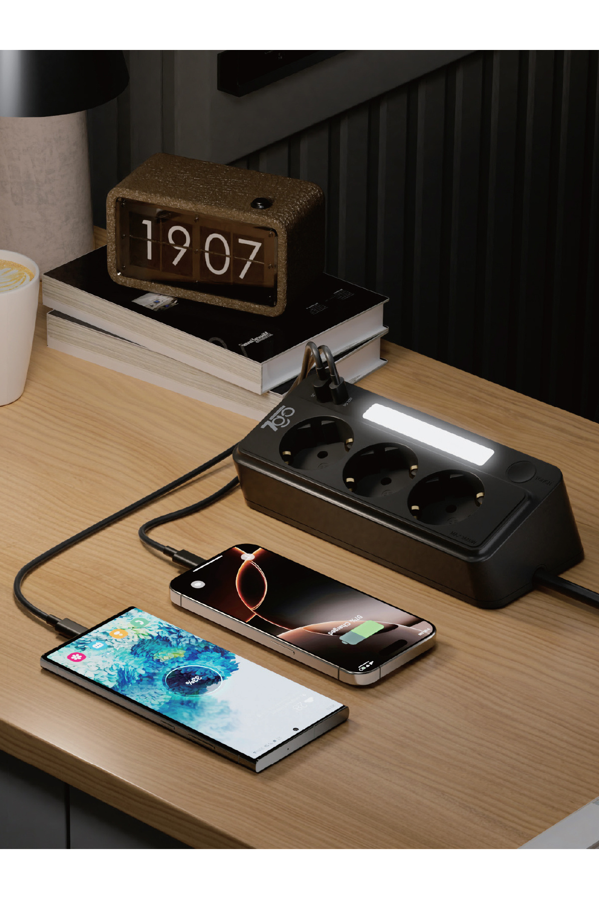 7GSP1 3680W 3'lü Priz Siyah | Akım Korumalı | 20W PD Hızlı Şarj USB | 1.9m Kablolu Akıllı LED Ge