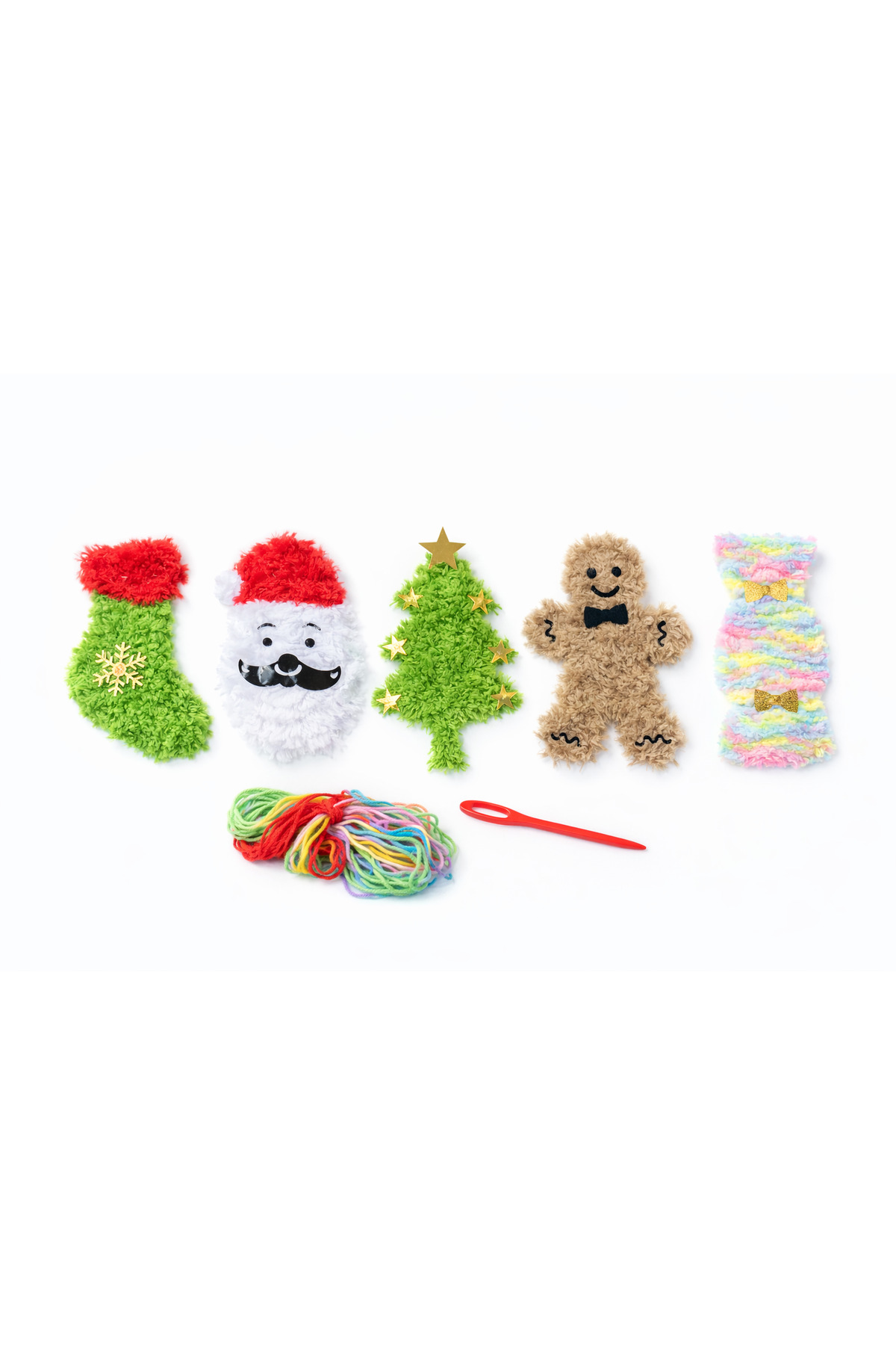 güvenli plastik iğne ve kalın yün iplerle kendi tasarımlarını oluşturur, diker, süsler ve ortaya şahane bir çalışma çıkarır.