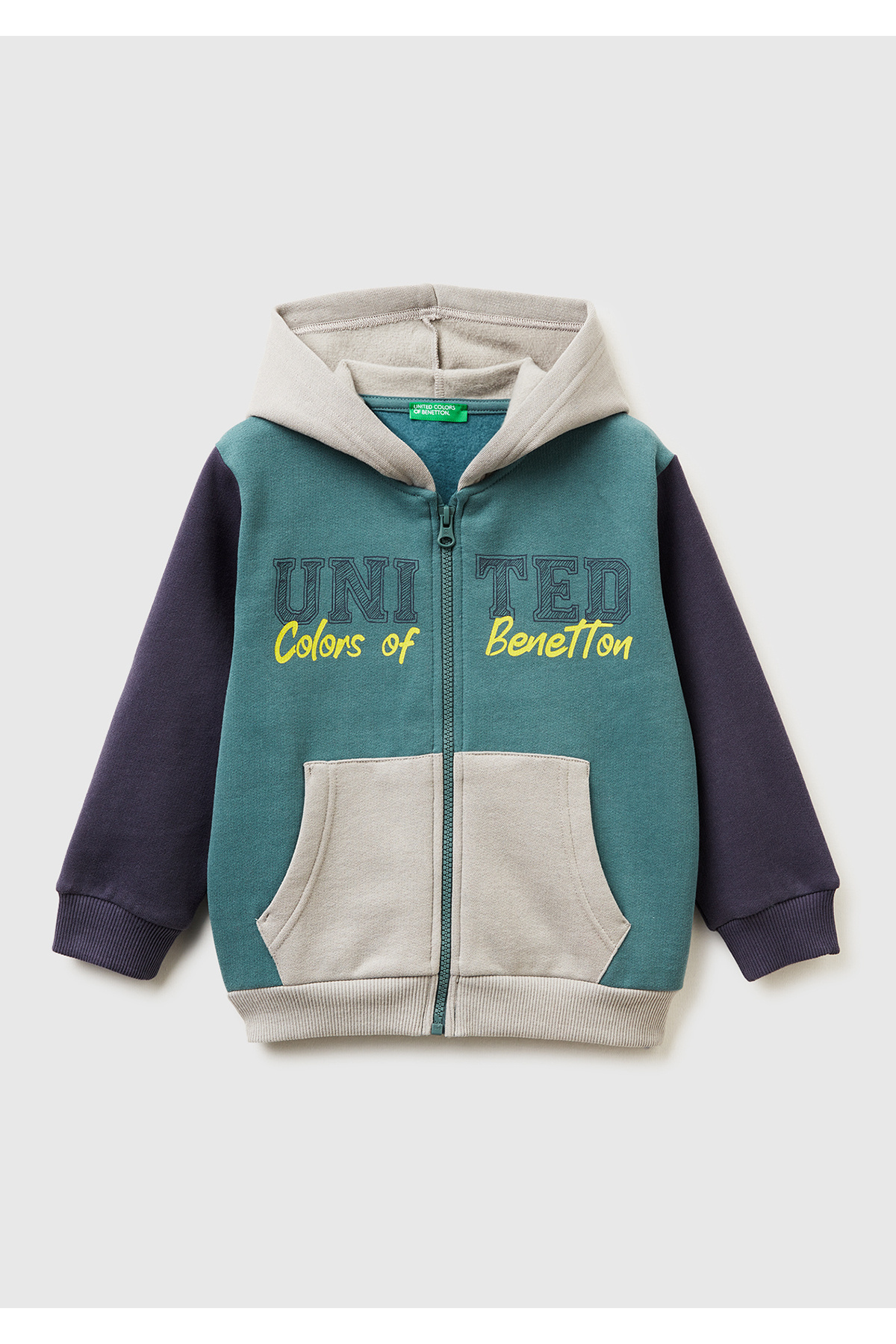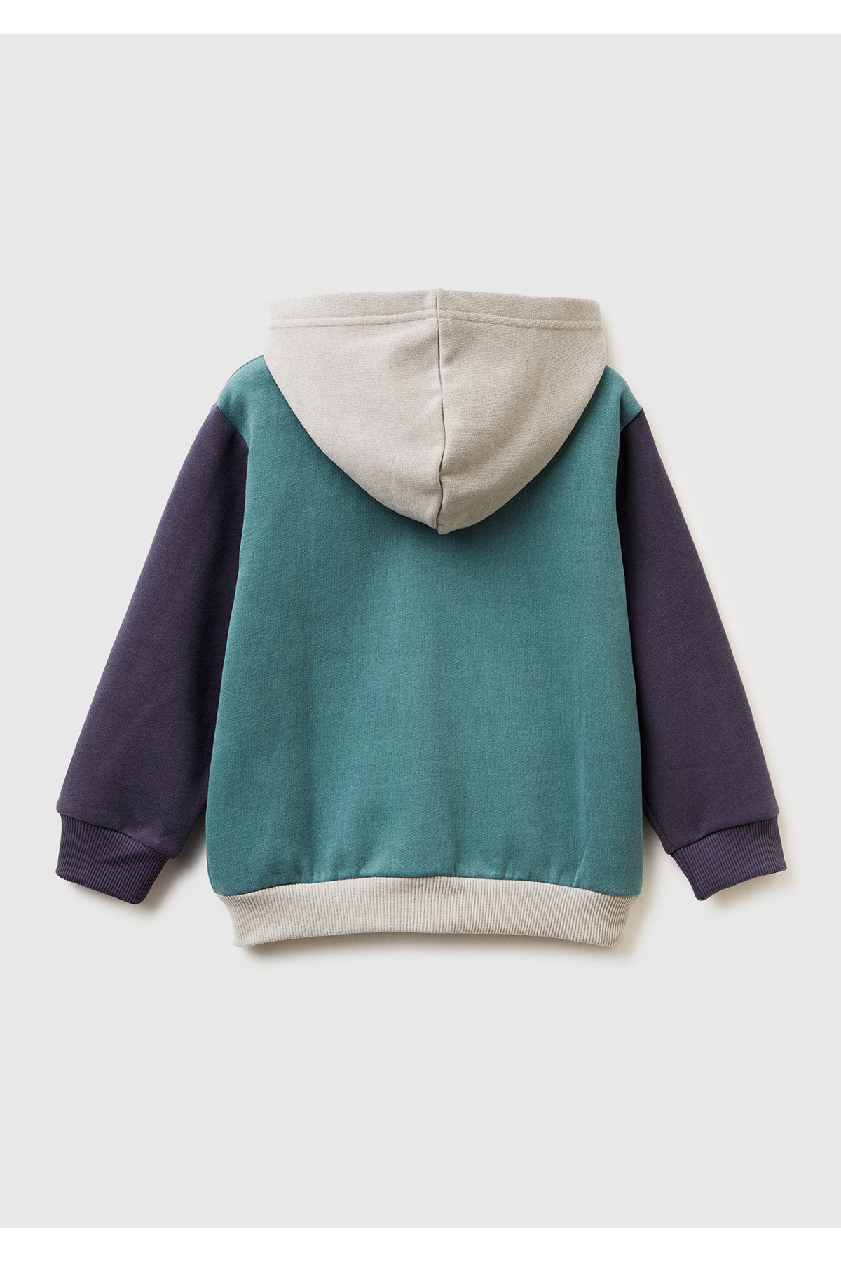 Erkek Çocuk Koyu Yeşil-Gri Önü Logo Baskılı Fermuarlı Regular Fit Kapüşonlu Sweatshirt
