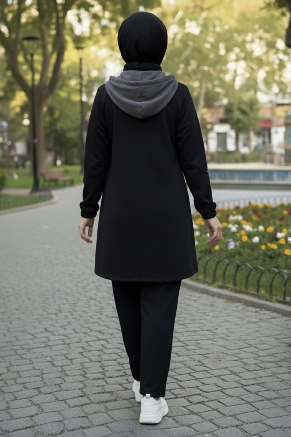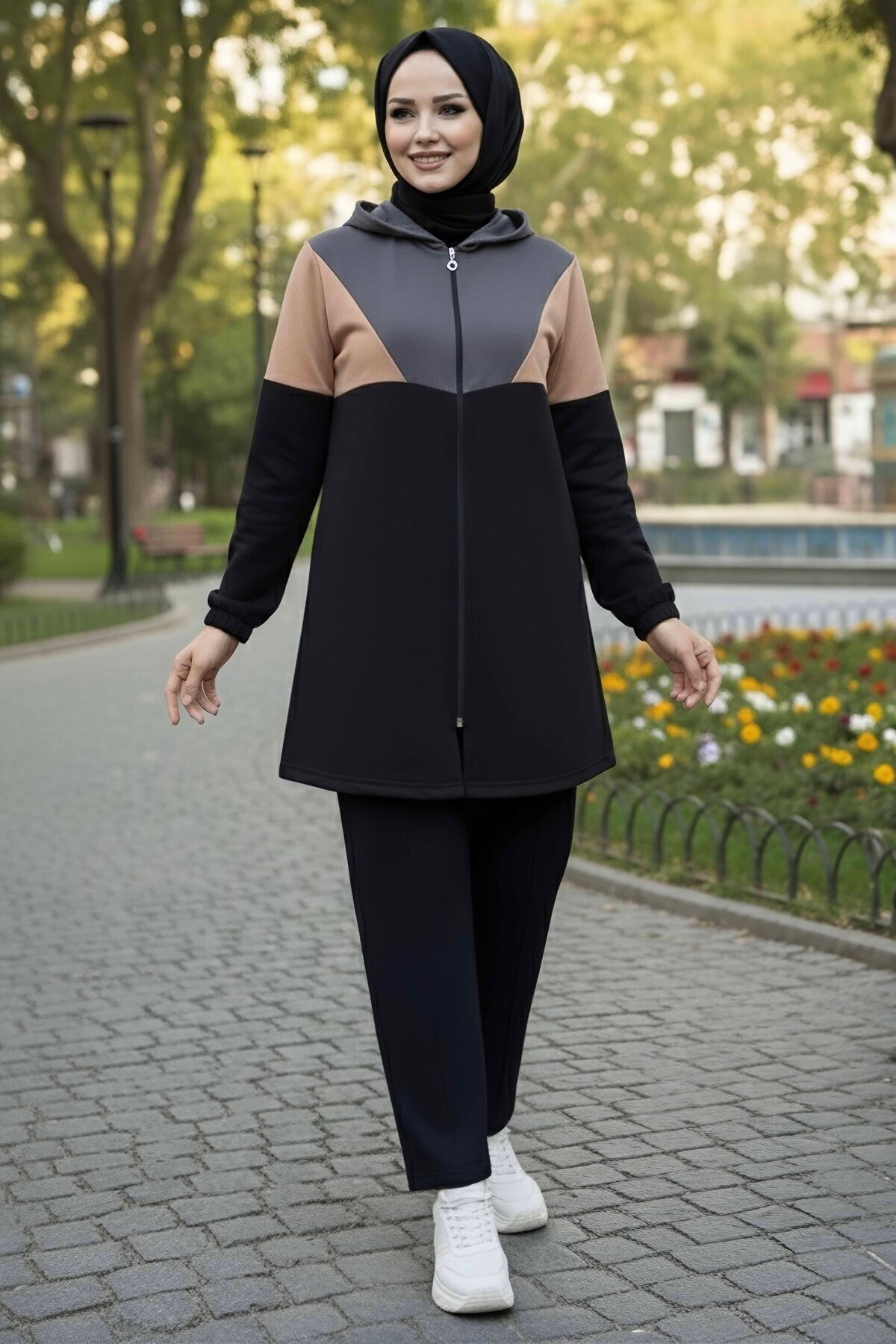 Garnili Fermuarlı İki İplik Tunik Pantolon Füme - 13107-FUME