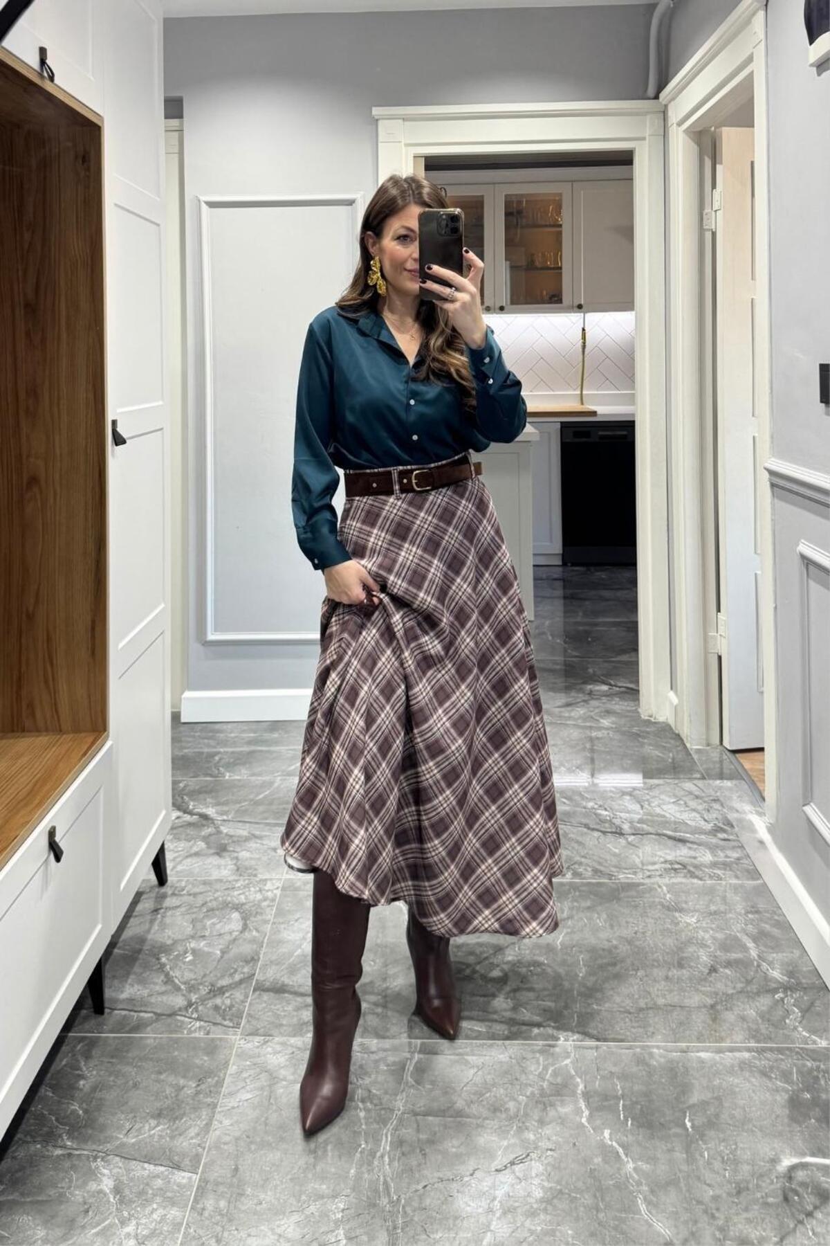 Ekose Kemerli Etek Kahve-Siyah