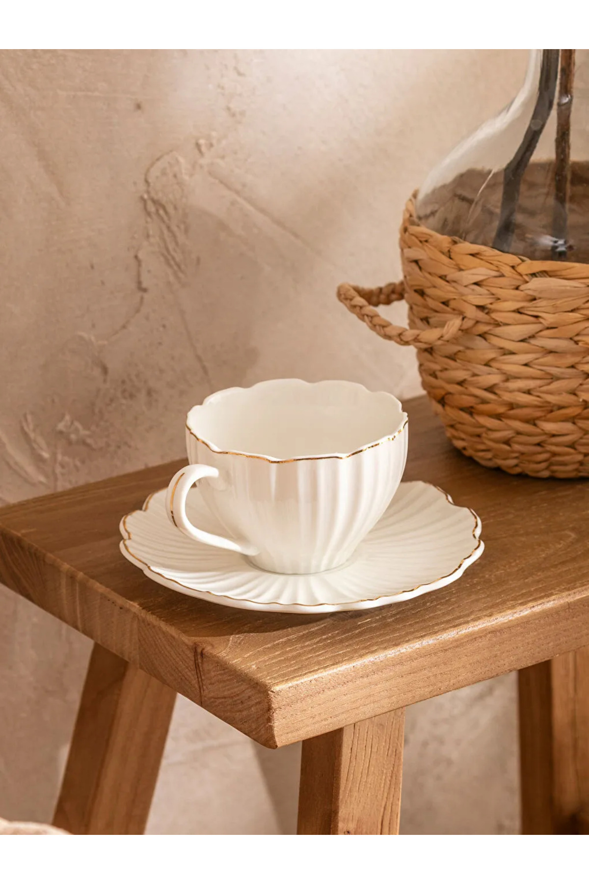 Yivli yüzey dokusuna sahip kahve fincanı ve tabağı, dalgalı kenar kesimlidir.
