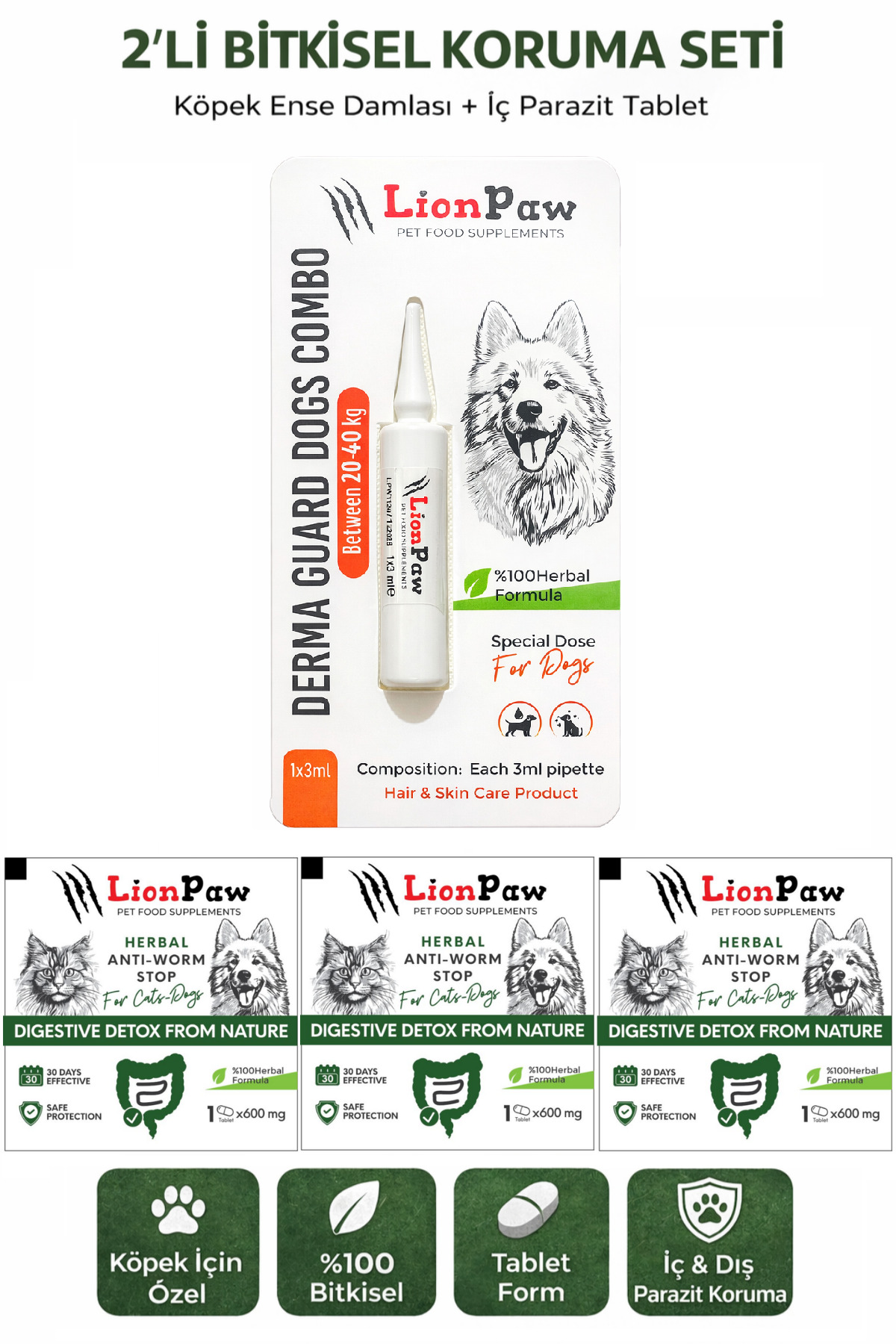 2'li Set Köpek 20-40 Kg İç Dış Anti Parazit Bitkisel 1 Ense Damla Ve 3 Tablet Seti