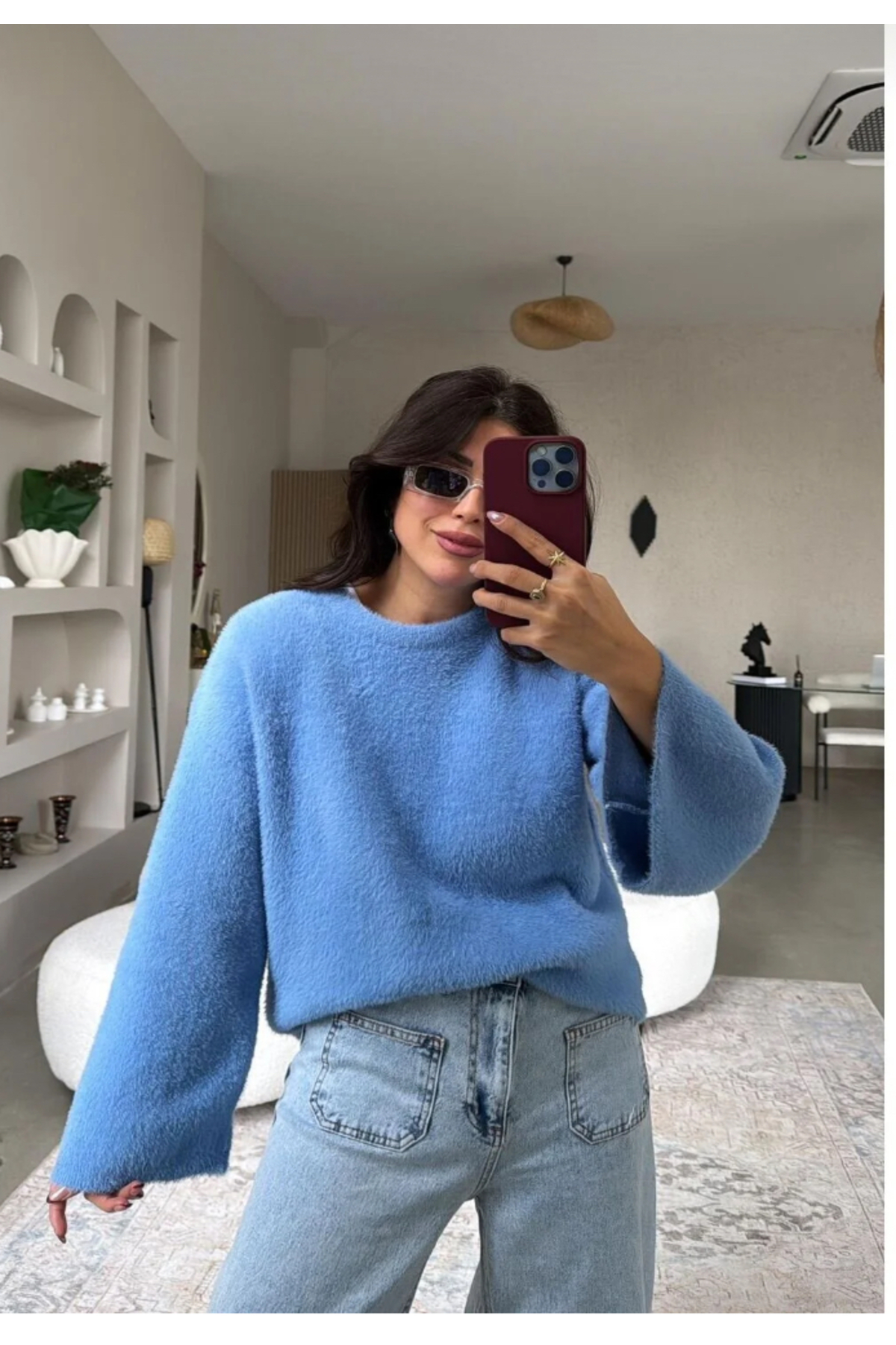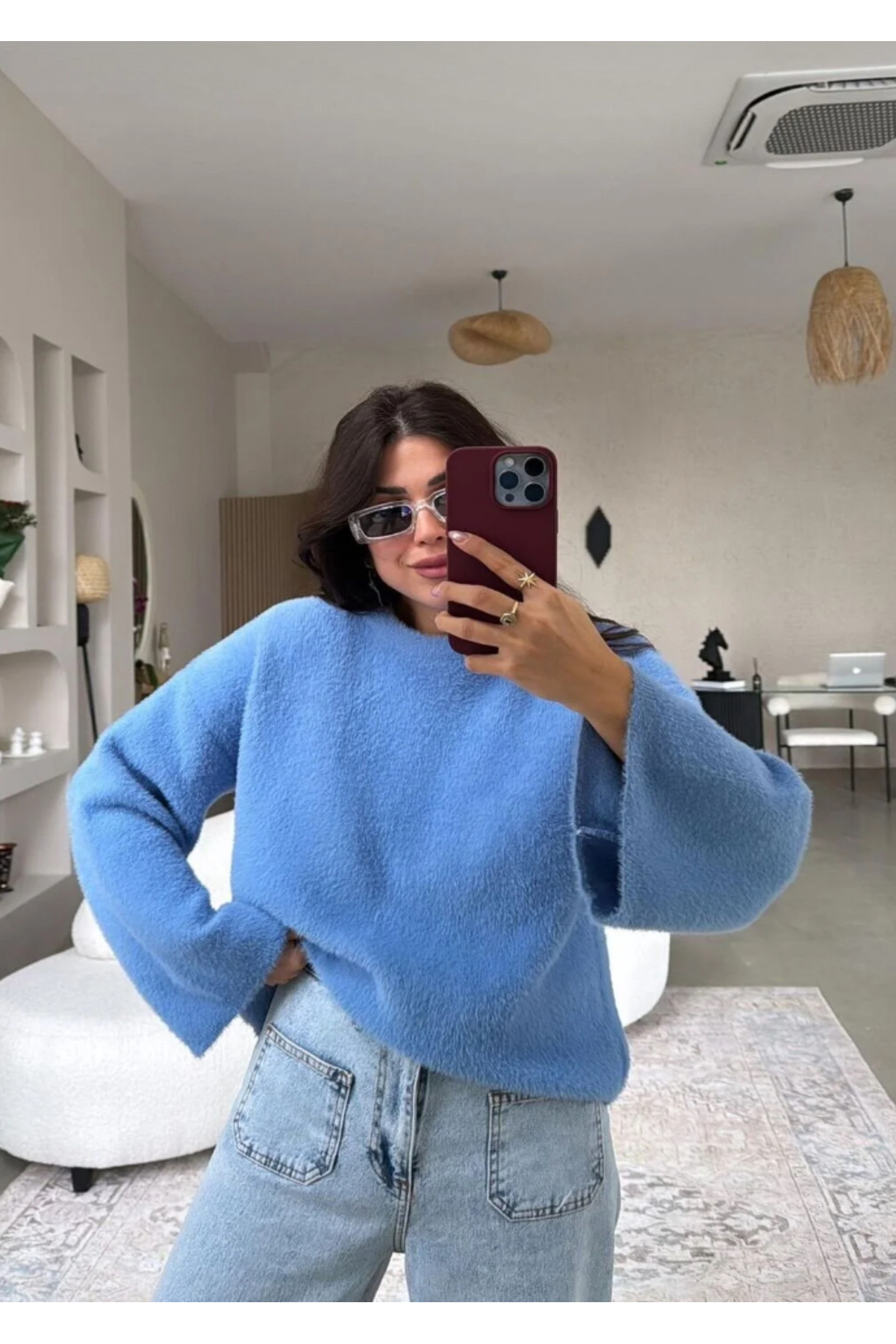 Elchee mavi boru kol yumuşak dokulu sakallı iplik yumoş kazak