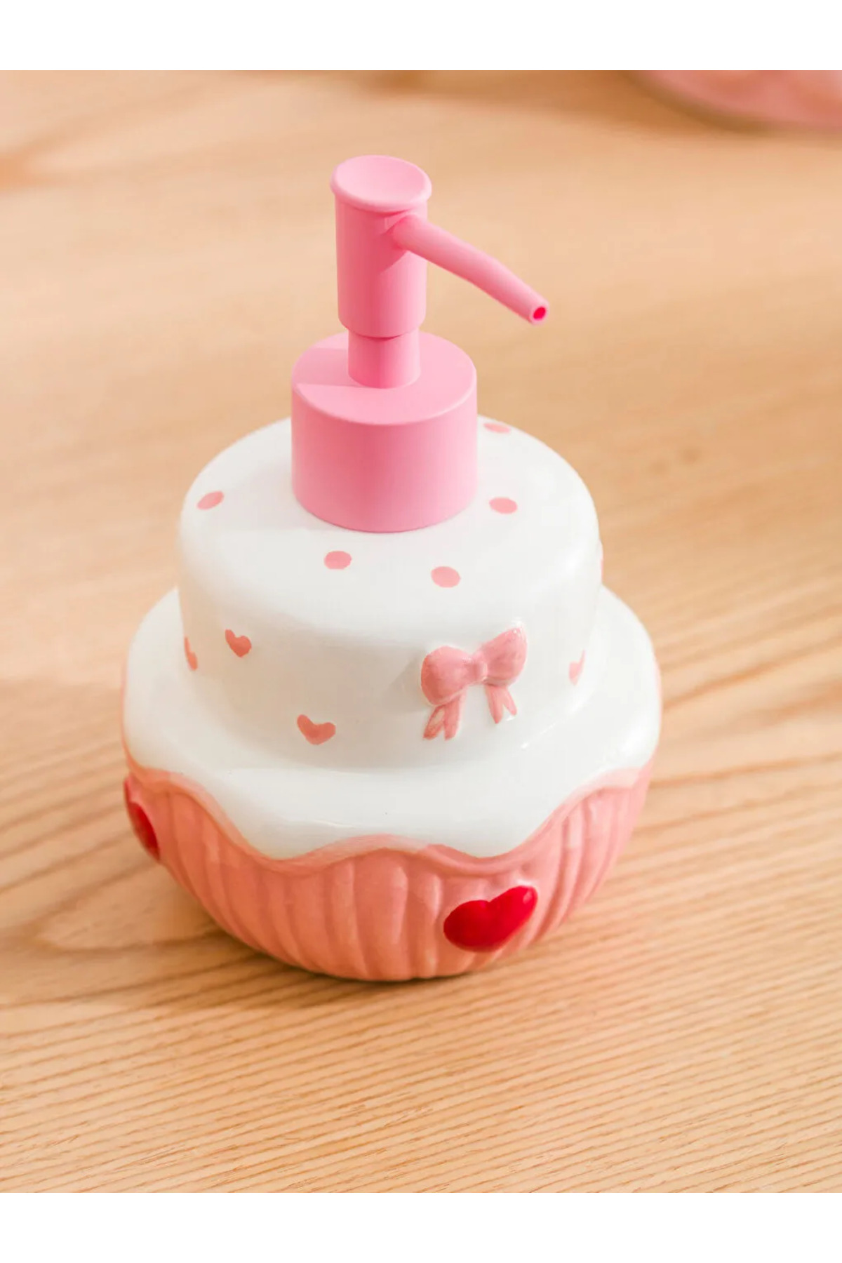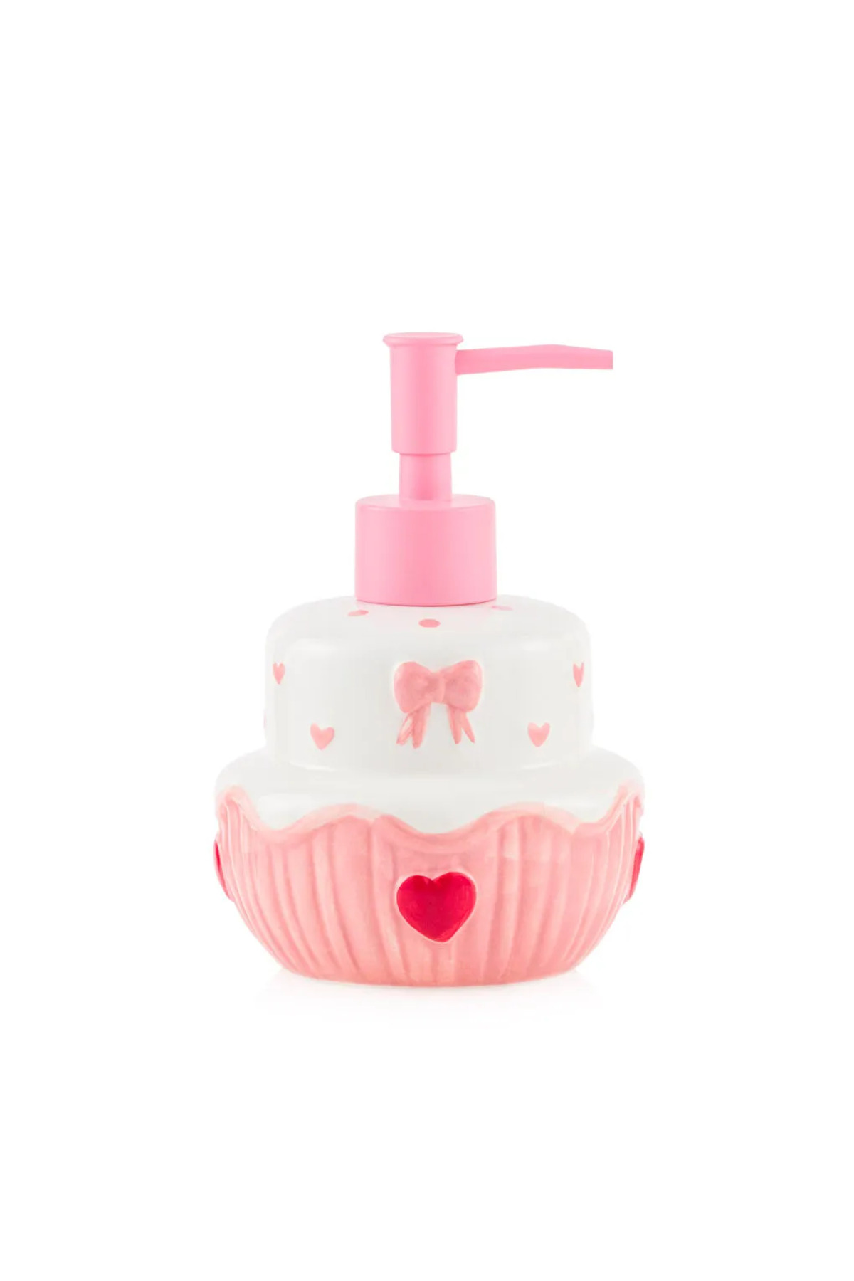 Pasta formunda tasarlanan sıvı sabunluk, kalp ve fiyonk desenleri ile kabartma detaylara sahiptir.