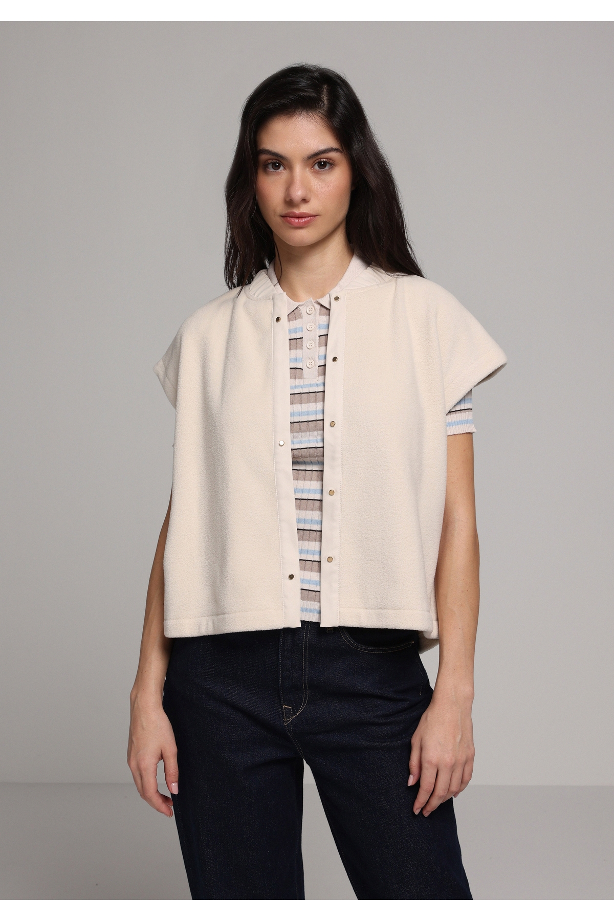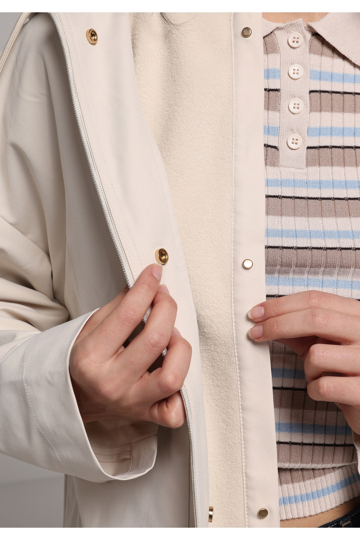 Ekru tonlarındaki bu yağmurluğu, yüksek bel jean ve renkli bir crop-top ile tamamla.
