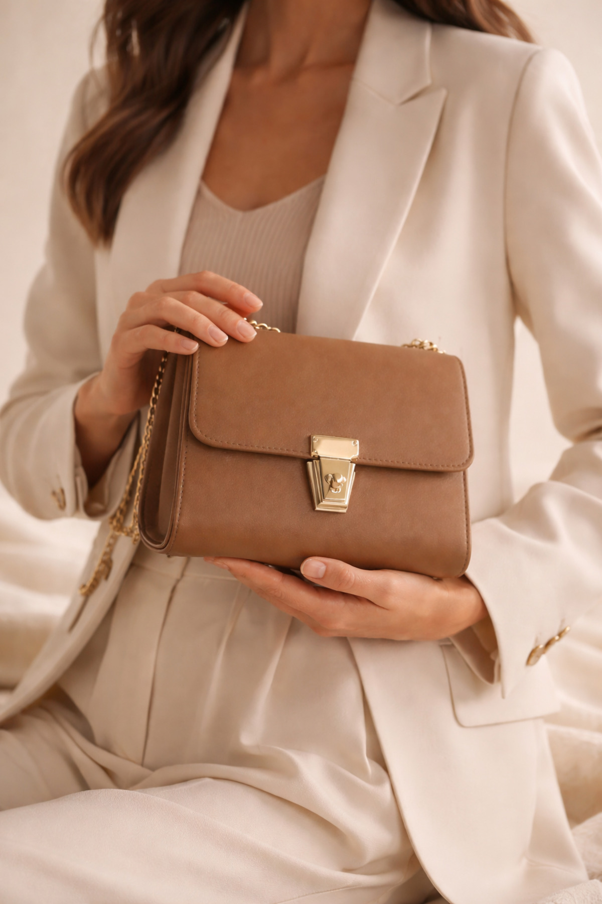 Kadın Kahverengi Zincir Askılı Mini Omuz & Çapraz Çanta – Gold Kilit Detaylı Şık Tasarım