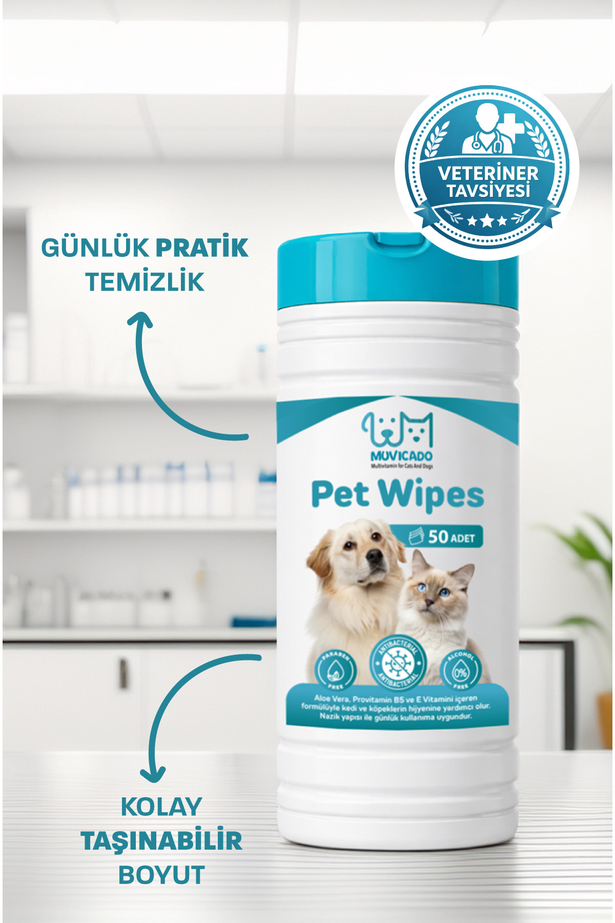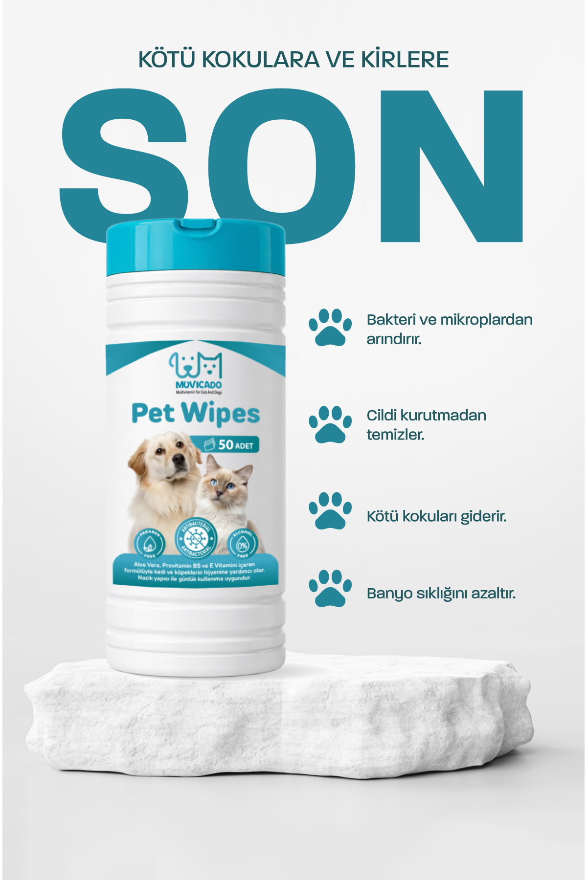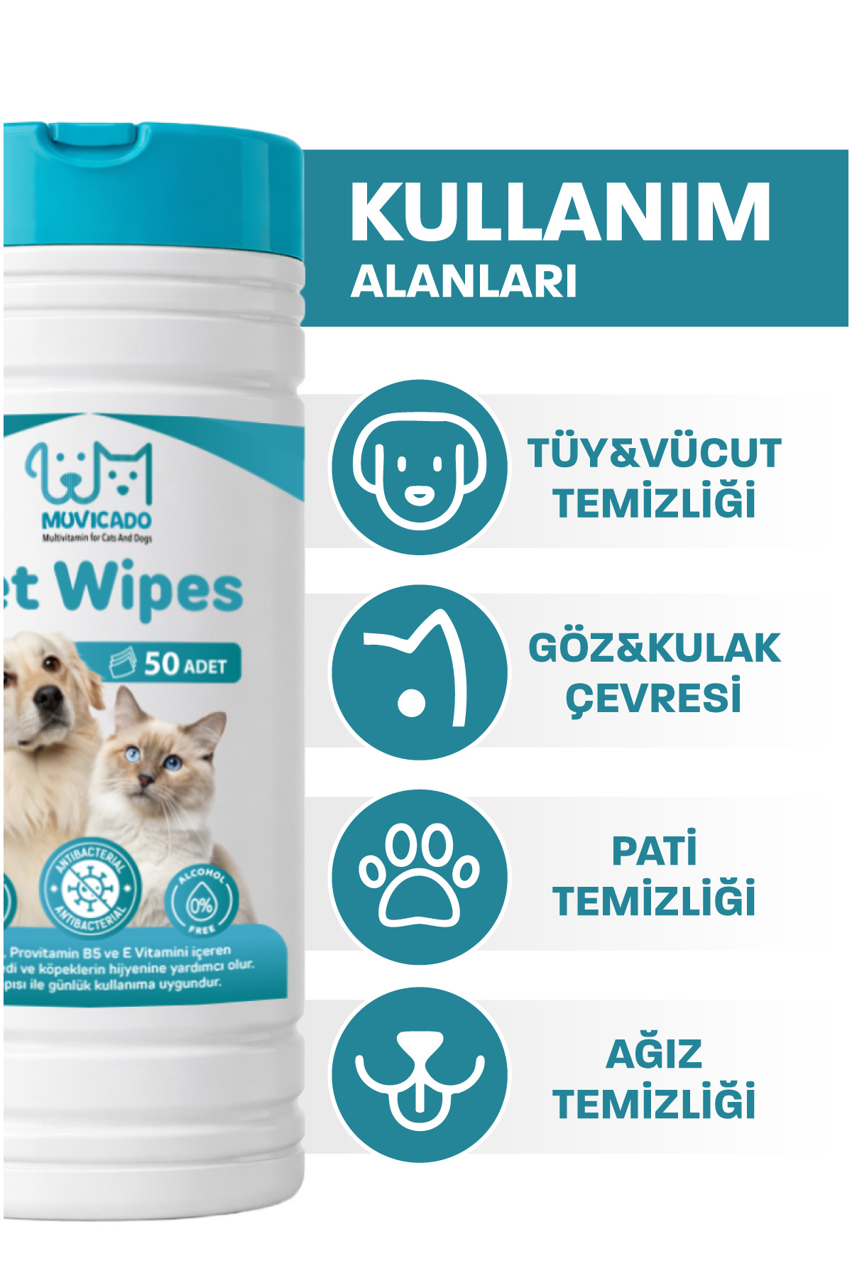 Kedi ve Köpekler İçin Kova Islak Mendil 50 Adet XL Muvicado Temizlik Havlusu, kedi ve köpeklerin günlük bakımını pratik, hijyenik ve nazik hale getirir.