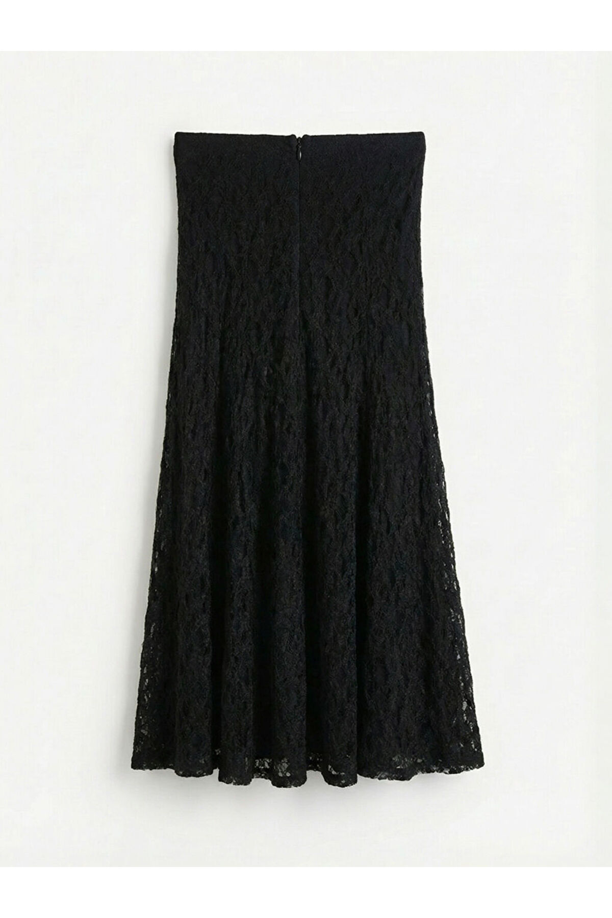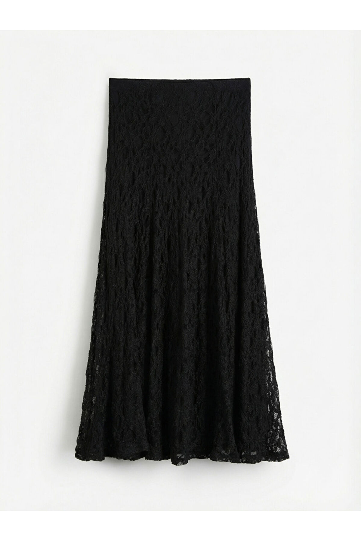 Tamamı dantel kumaştan üretilmiş, beli lastikli ve astarlı kadın etek, A kesim tasarıma sahiptir.
