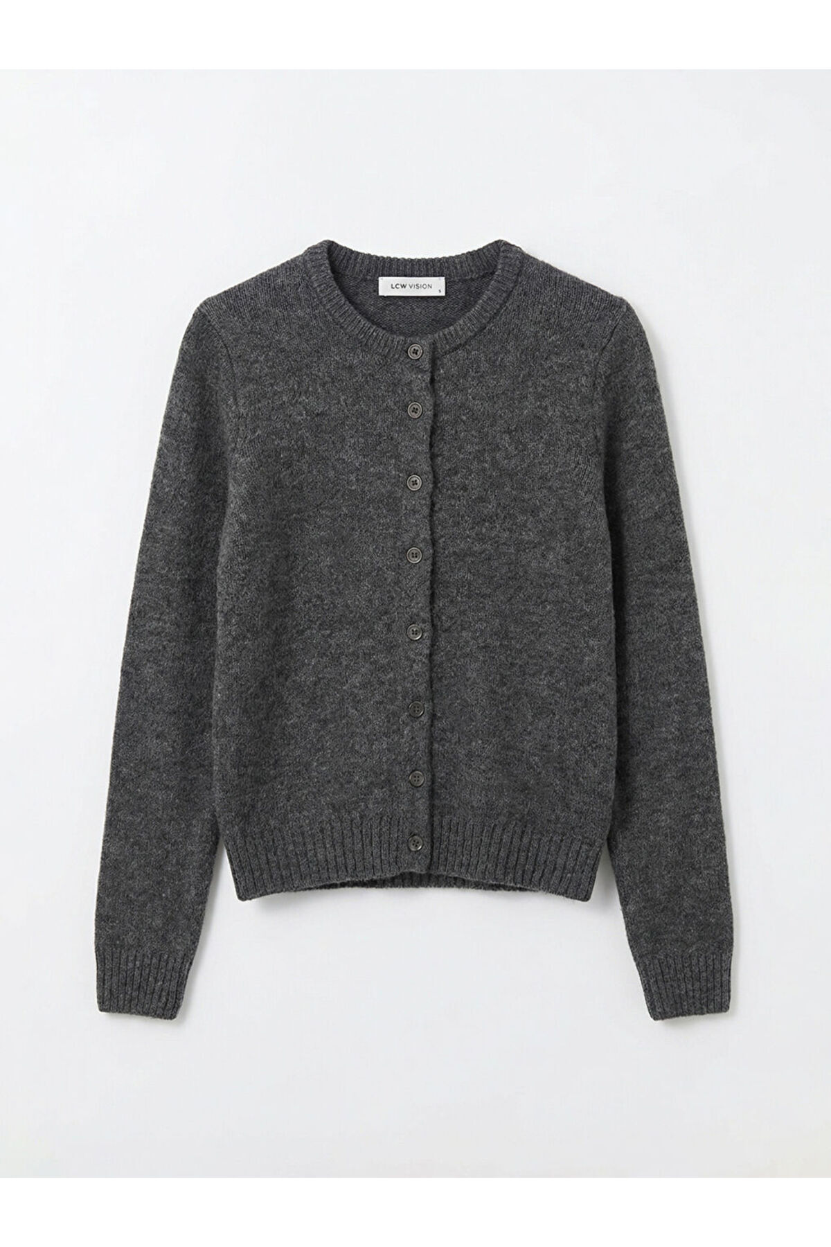 Bisiklet yaka ve uzun kollu kadın hırka, triko kumaştan üretilmiştir.