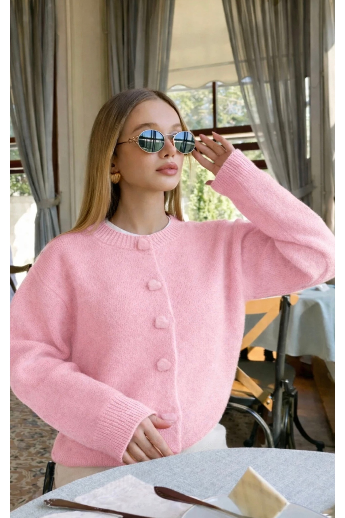 • Özel Tasarım Düğmeler: Hırkanın ön kısmında yer alan ikonik kalp formundaki düğmeler, kombininize zarif ve sempatik bir hava katar.