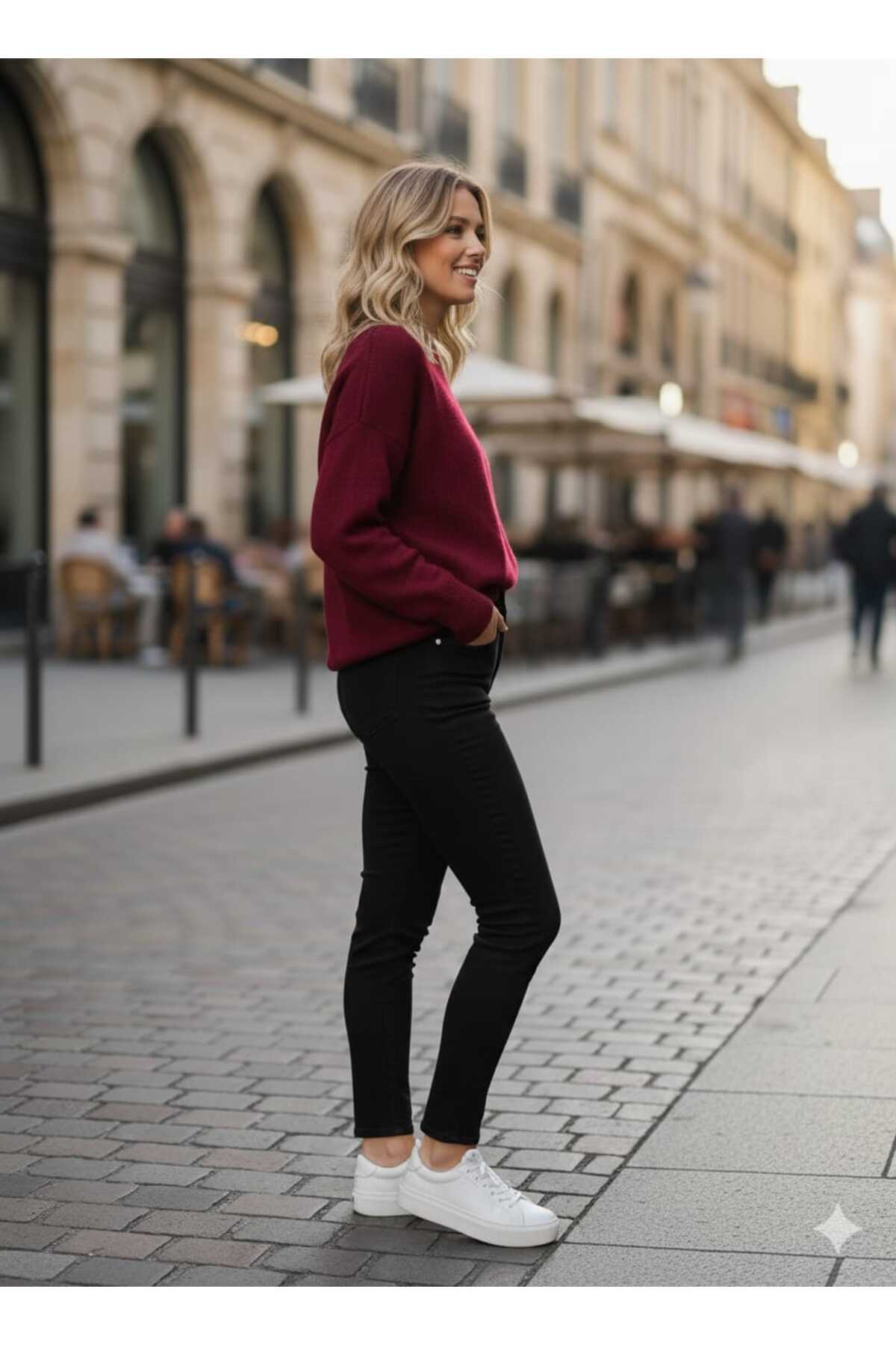 - Bordo bisiklet yaka oversize triko kazak, rahat ve şık bir görünüm sunar.