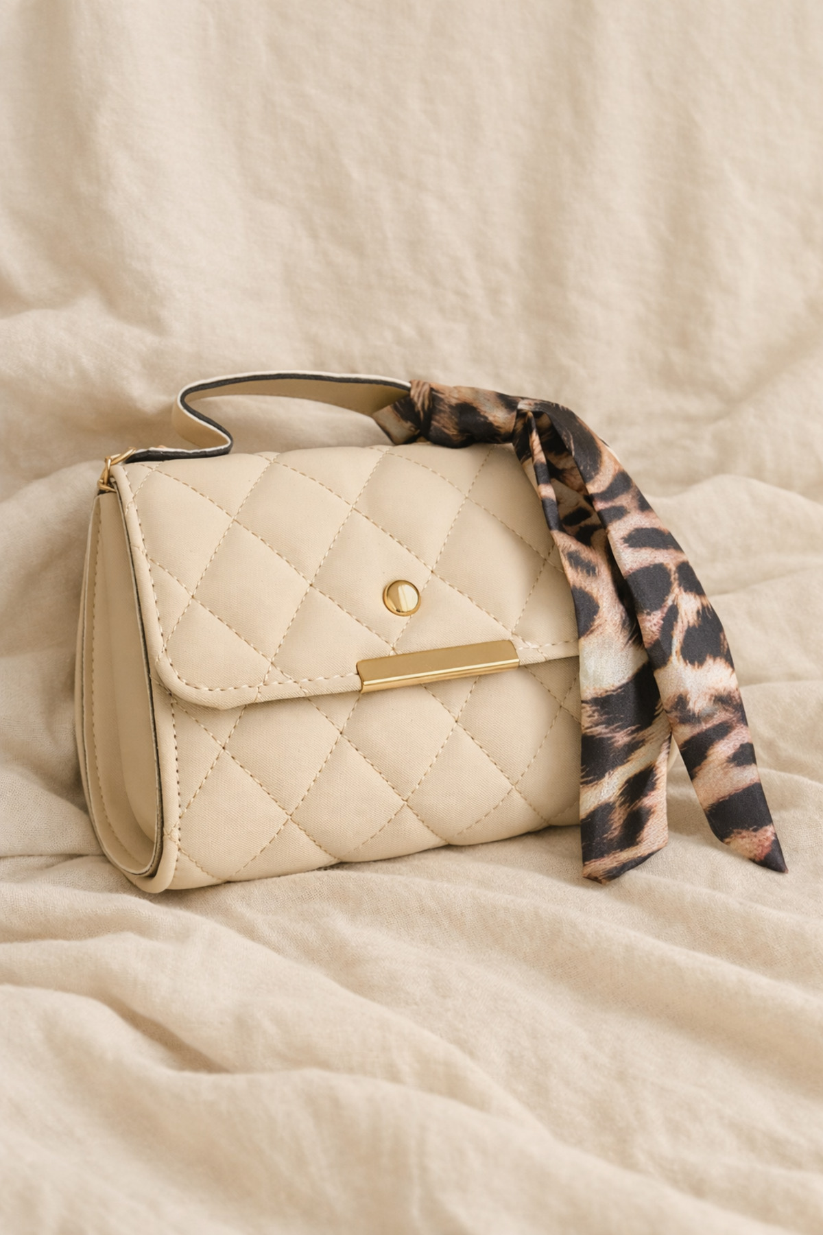 Krem Kapitone Kadın Omuz Çantası – Zincir Askılı Şallı Mini El ve Çapraz Çanta