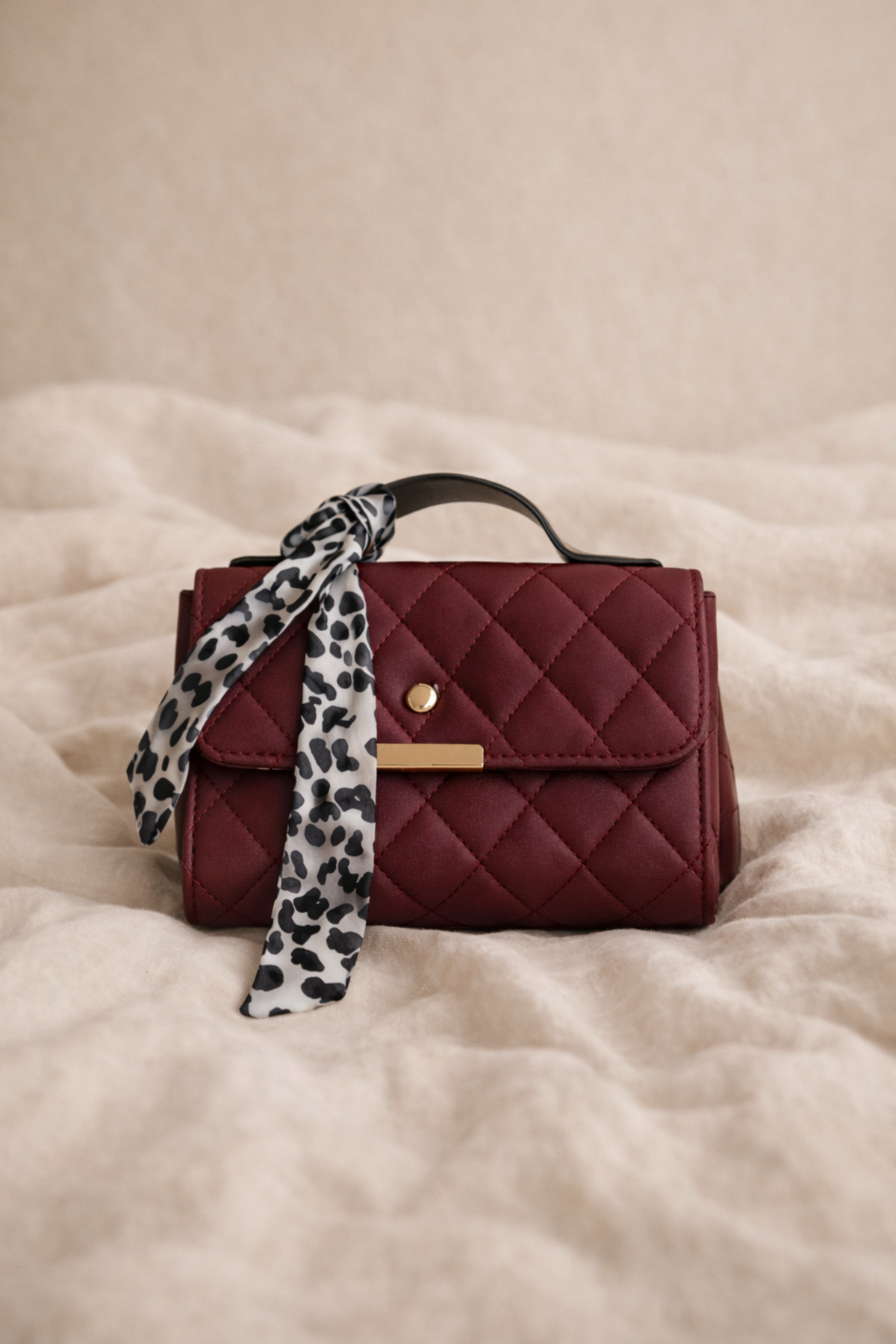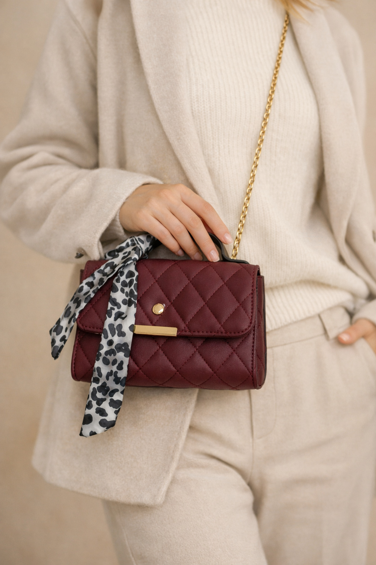Bordo Kapitone Kadın Omuz Çantası – Zincir Askılı Şallı Mini El ve Çapraz Çanta