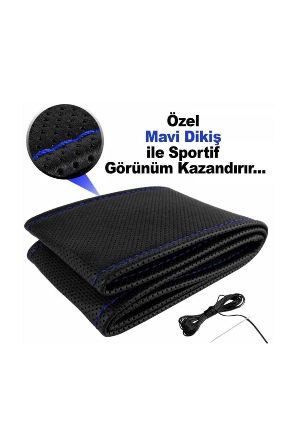 Deri Direksiyon Kılıfı Sarmalı Dikmeli Mavi Dikişli Kokusuz