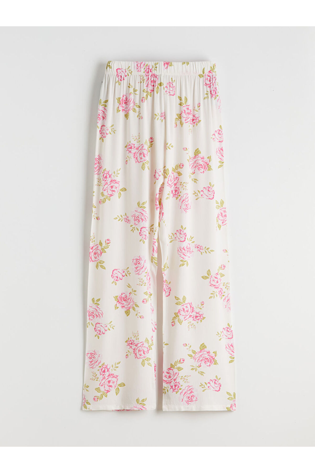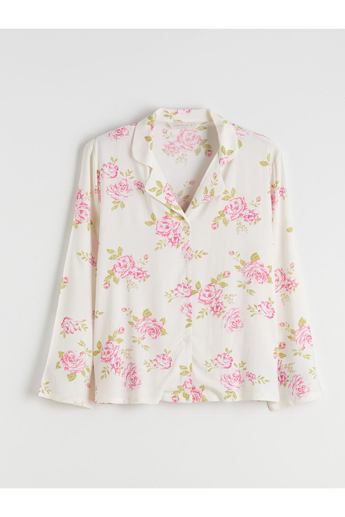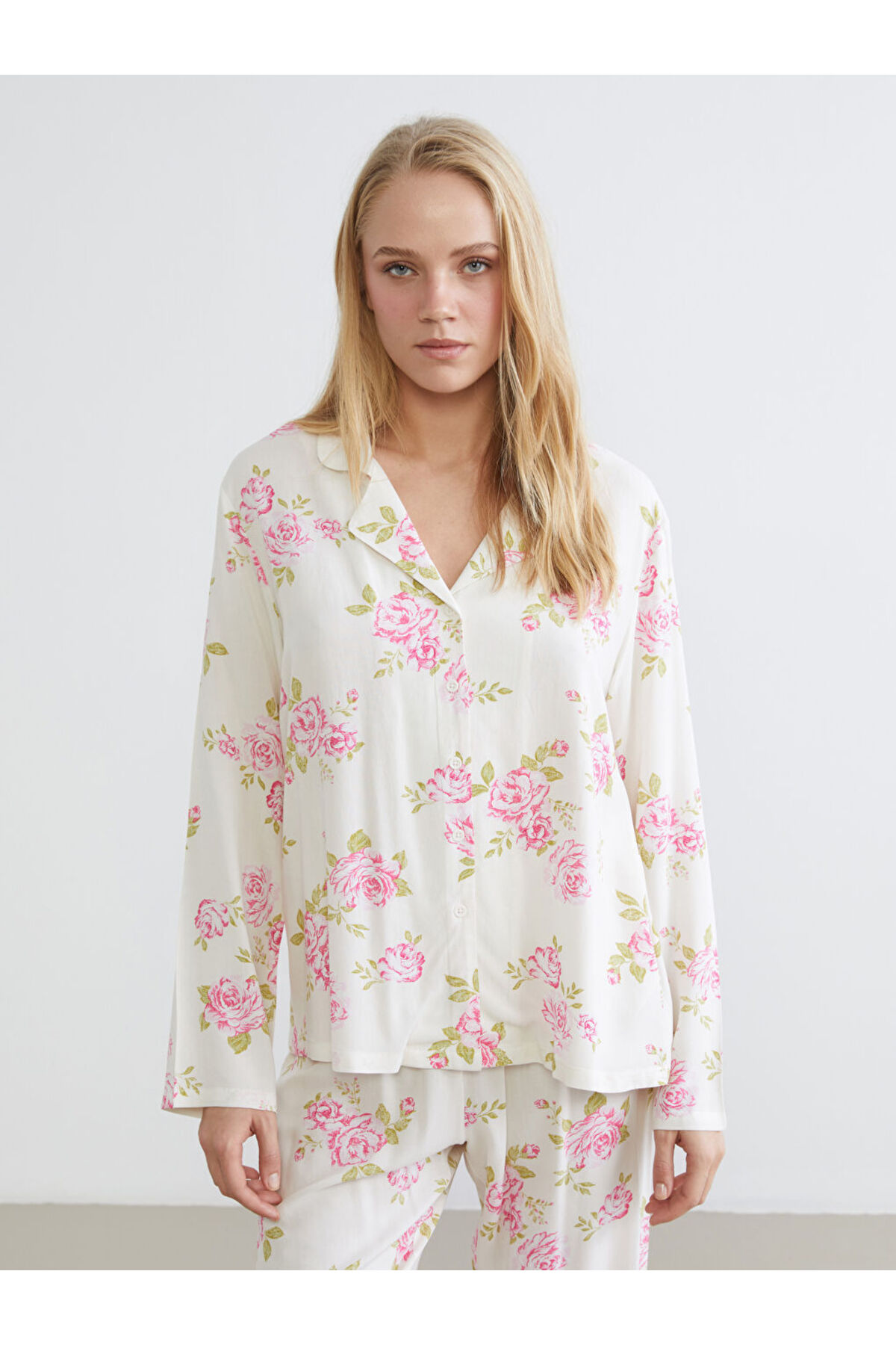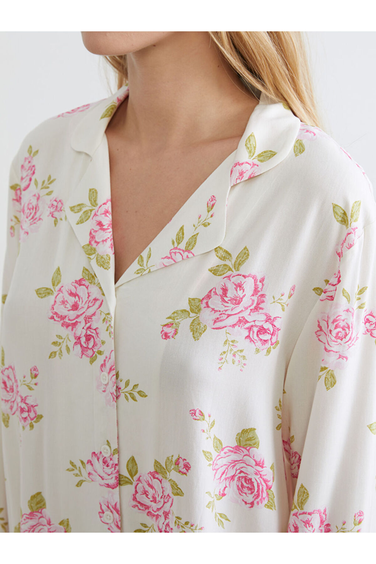 Ekru Gömlek Yaka Çiçekli Kadın Pijama Takım