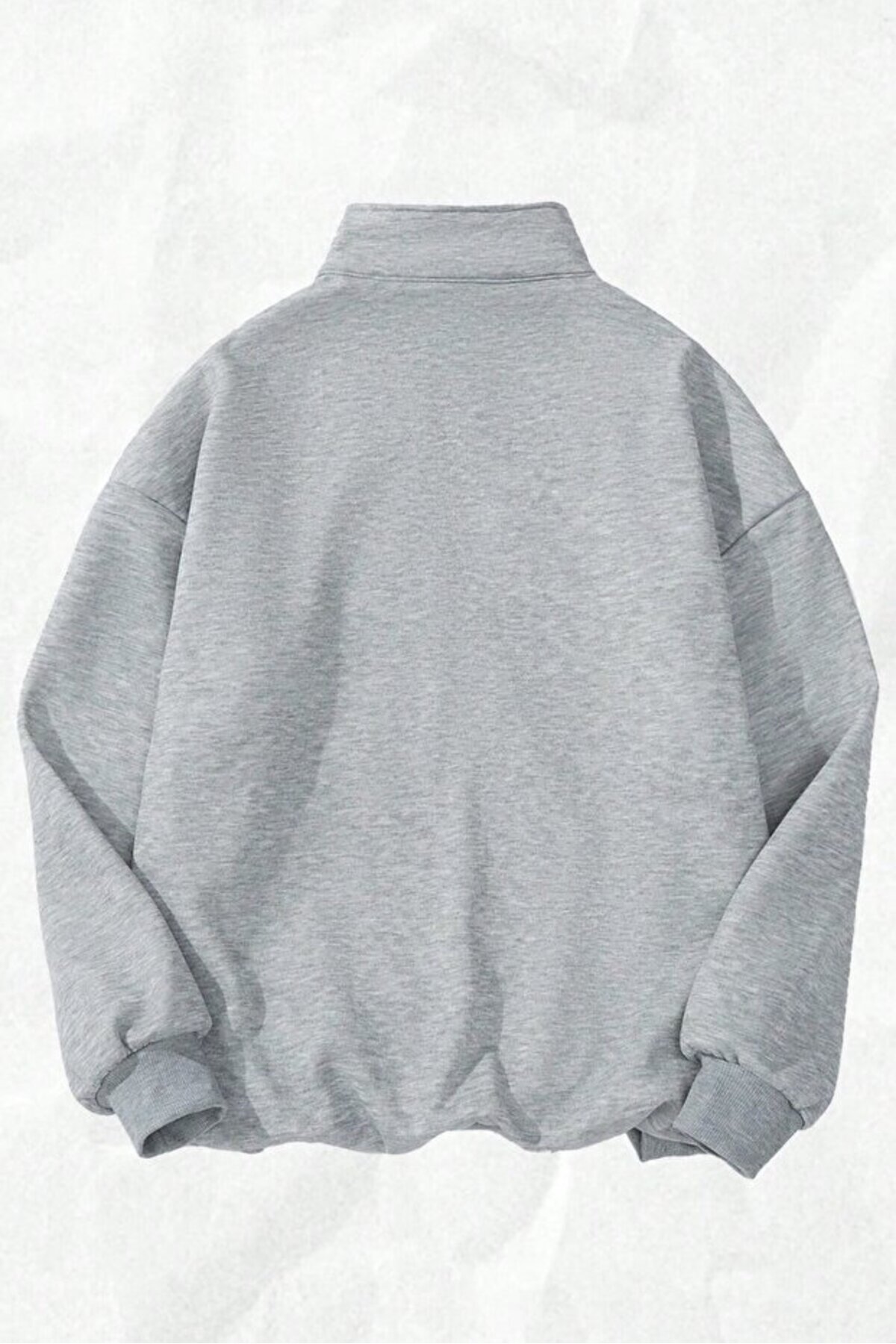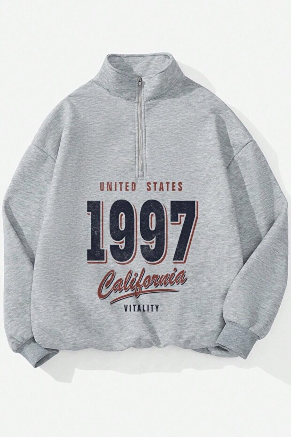 Unisex Yarım Fermuar Dik Yaka Gri 1997 Baskılı Oversize Gri Kışlık Sweatshirt