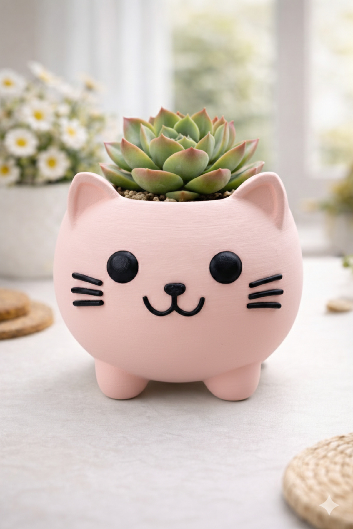 Sevimli Kedi Tasarımlı Mini Sukulent Kaktüs Bitki Saksısı Pembe