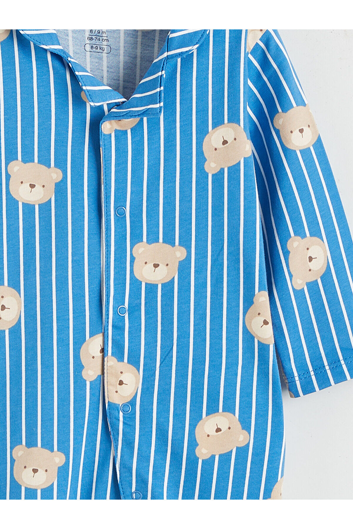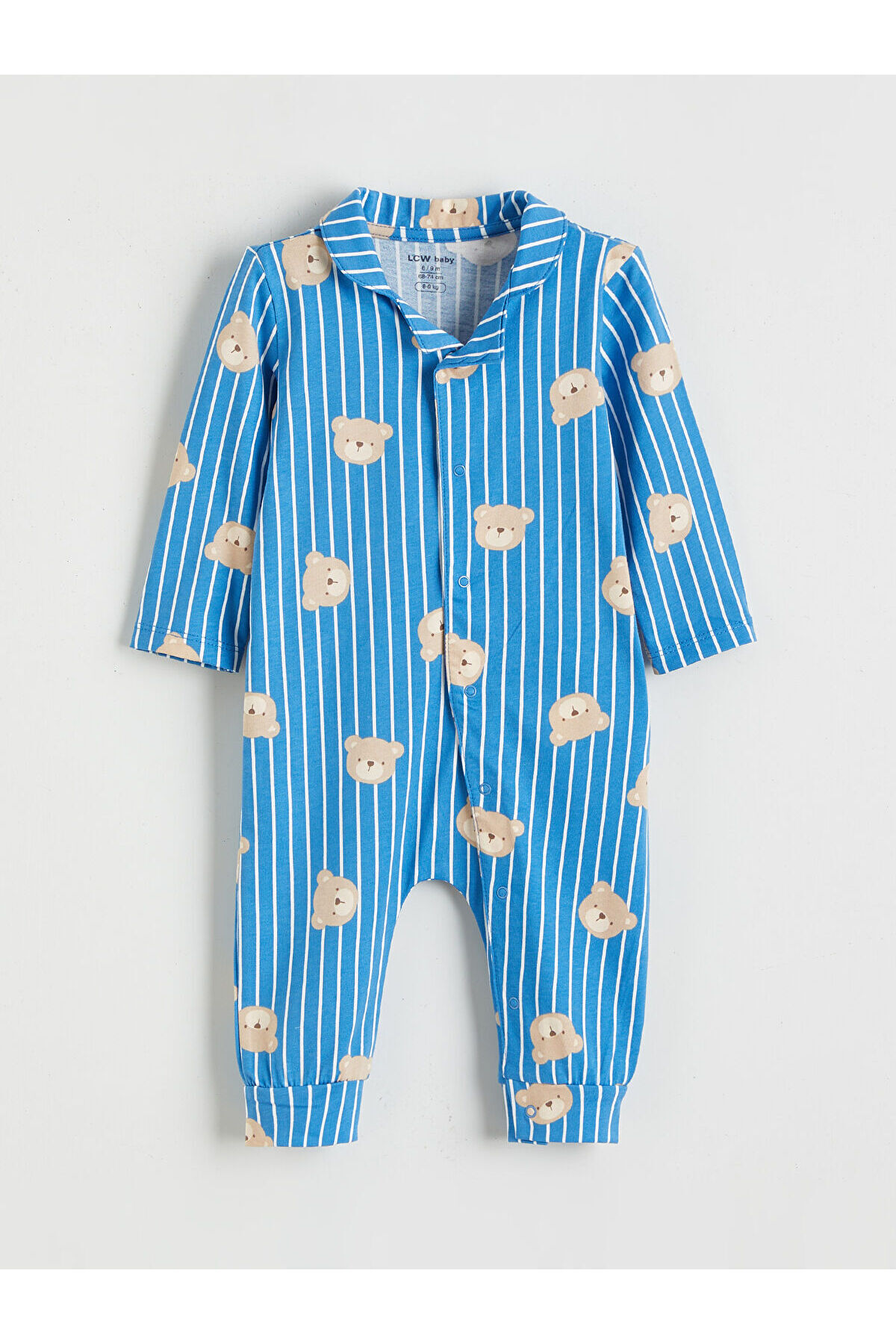 - Gömlek yakalı, çizgili ve desenli erkek bebek tulum, %100 pamuk penye kumaştan üretilmiştir.