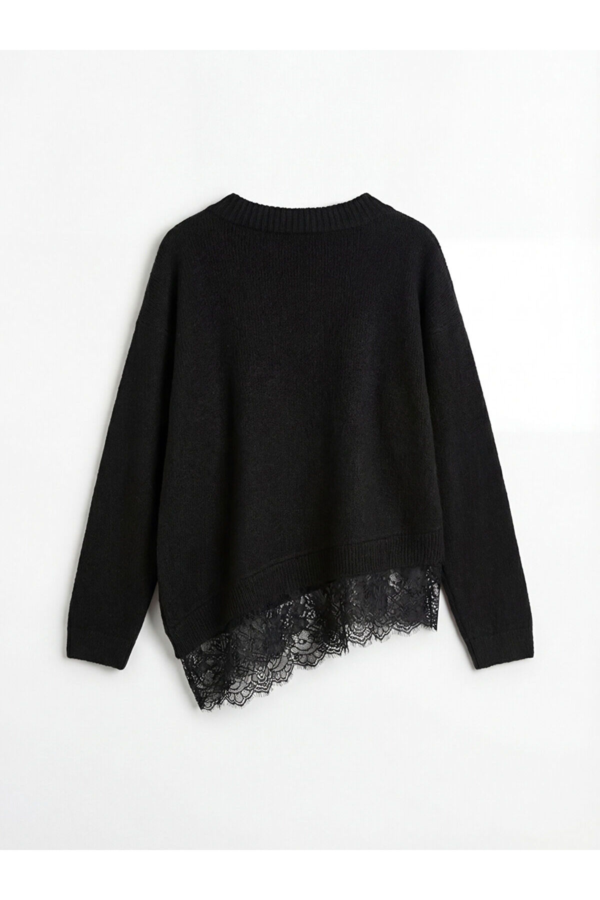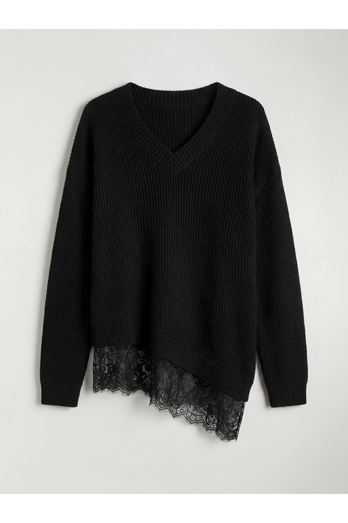 - - Fitilli dokulu, V yakalı ve uzun kollu kadın kazak, asimetrik kesimli etek ucunda dantel detayı bulunmaktadır.