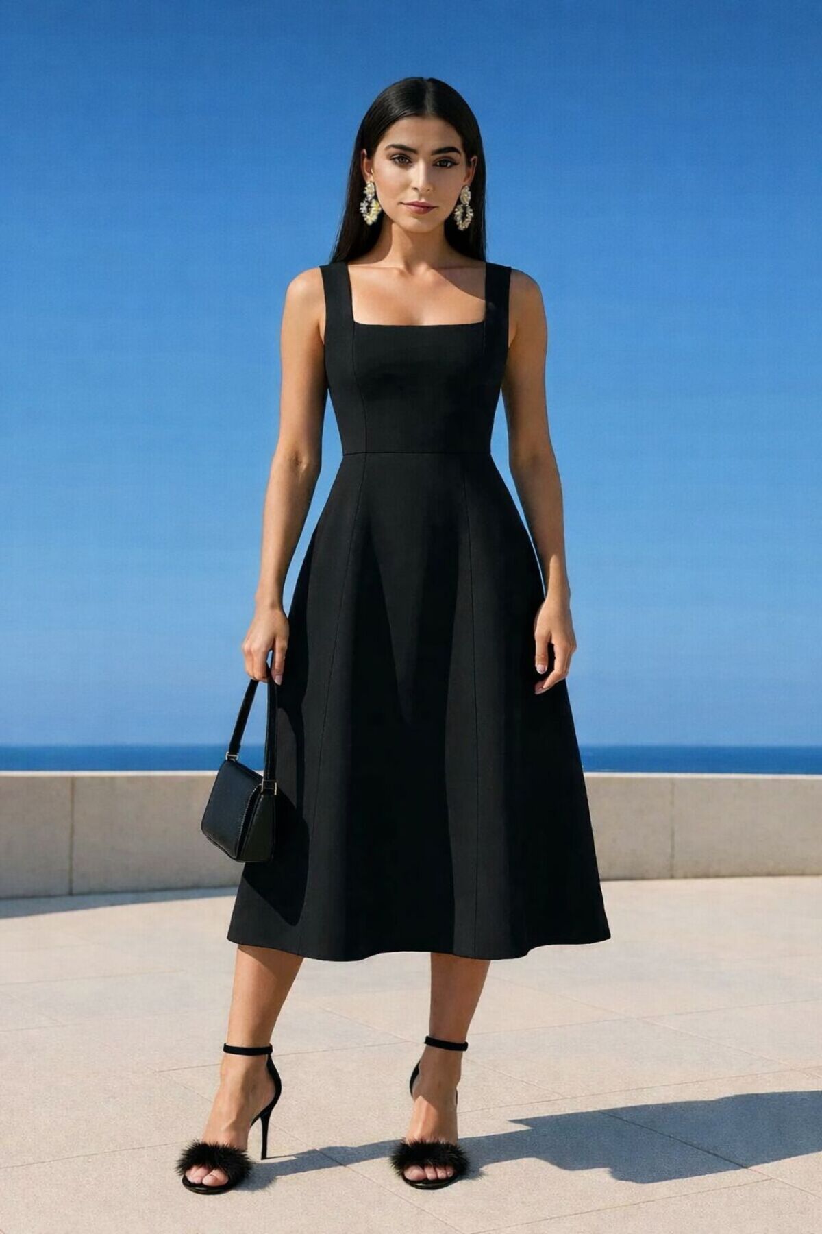 Kadın Kare Yaka Kalın Askı Tasarım Midi Boy Elbise