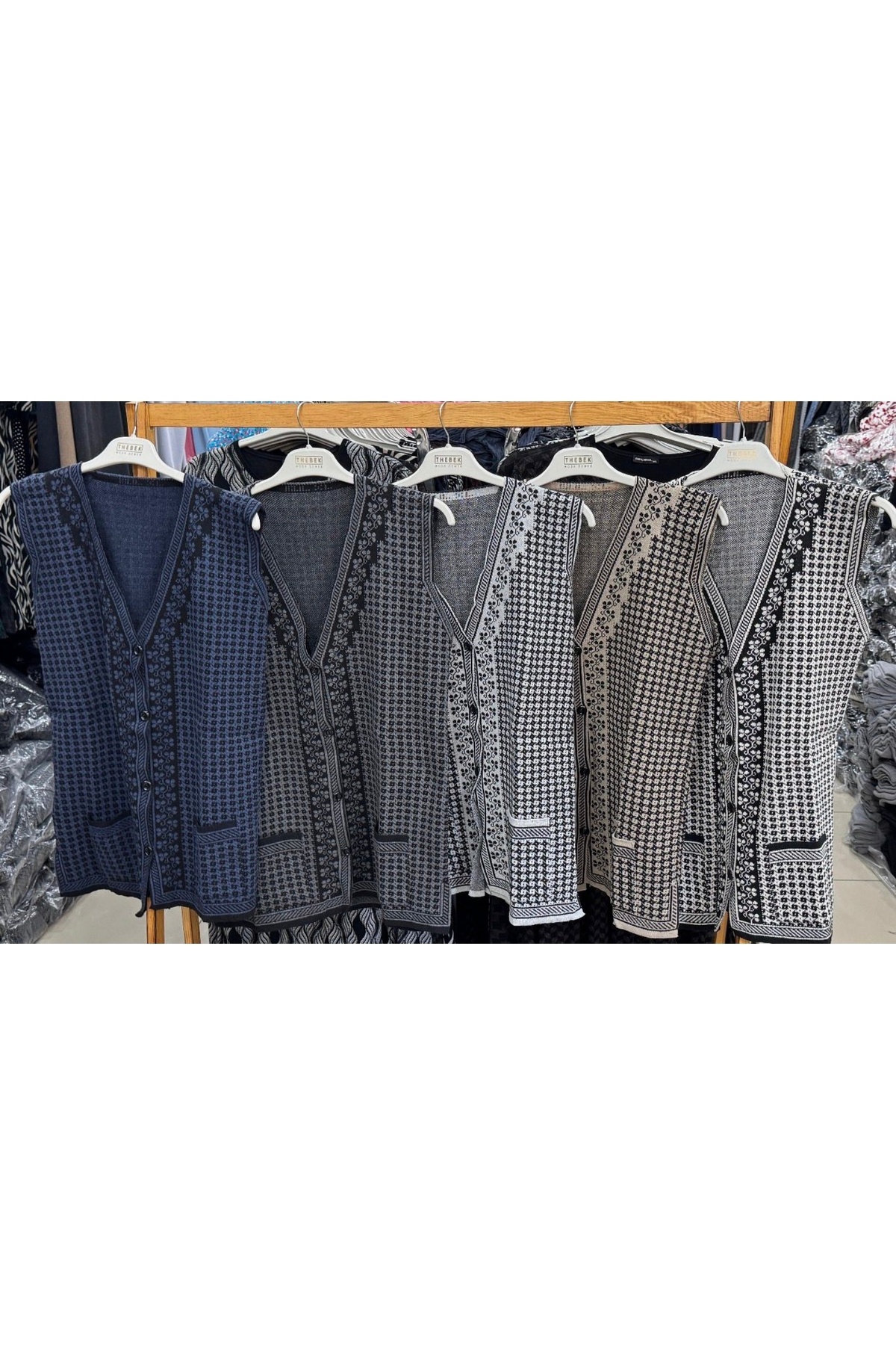 Kadın Triko Anne Yeleği Düğmeli Cepli Klasik Siyah Beyaz Desen