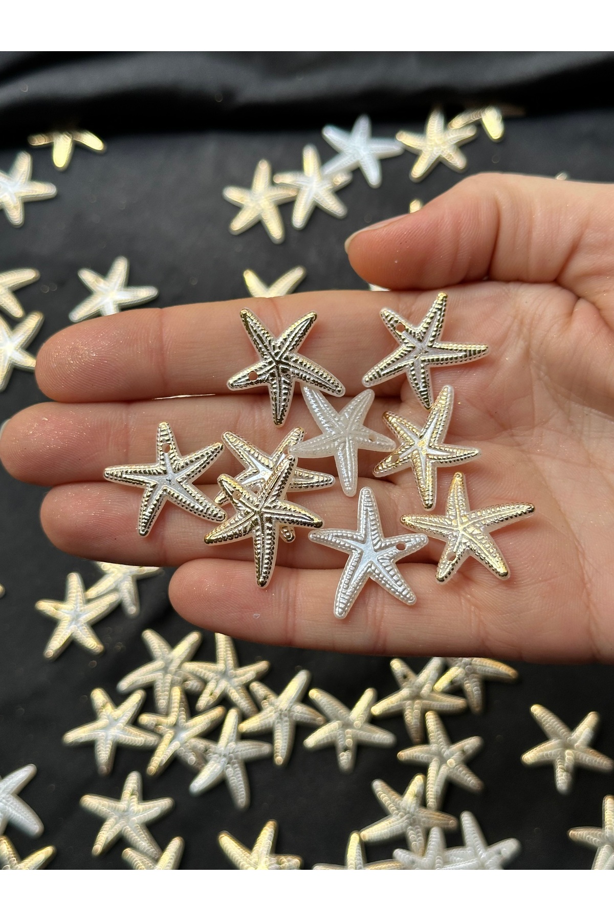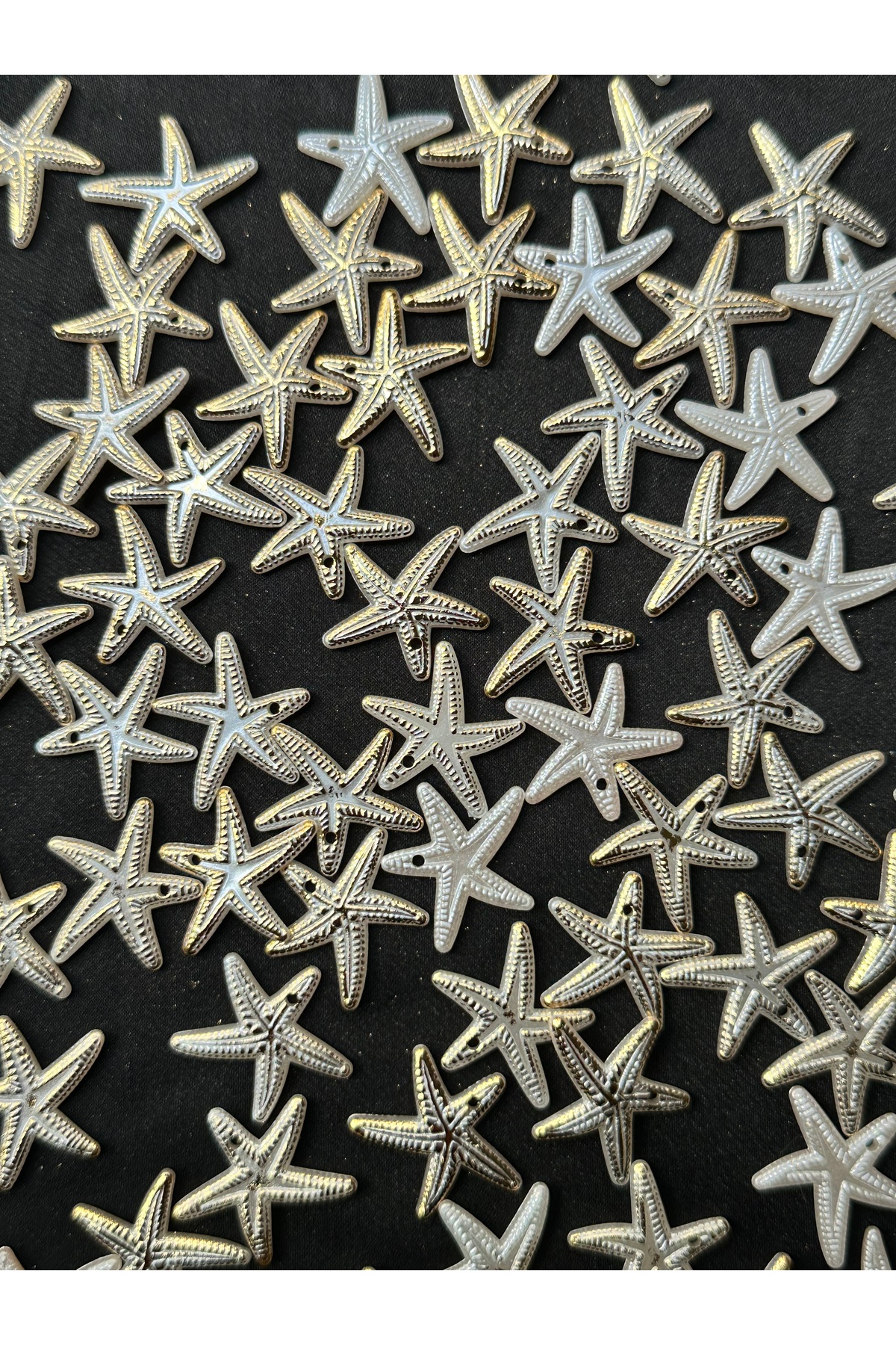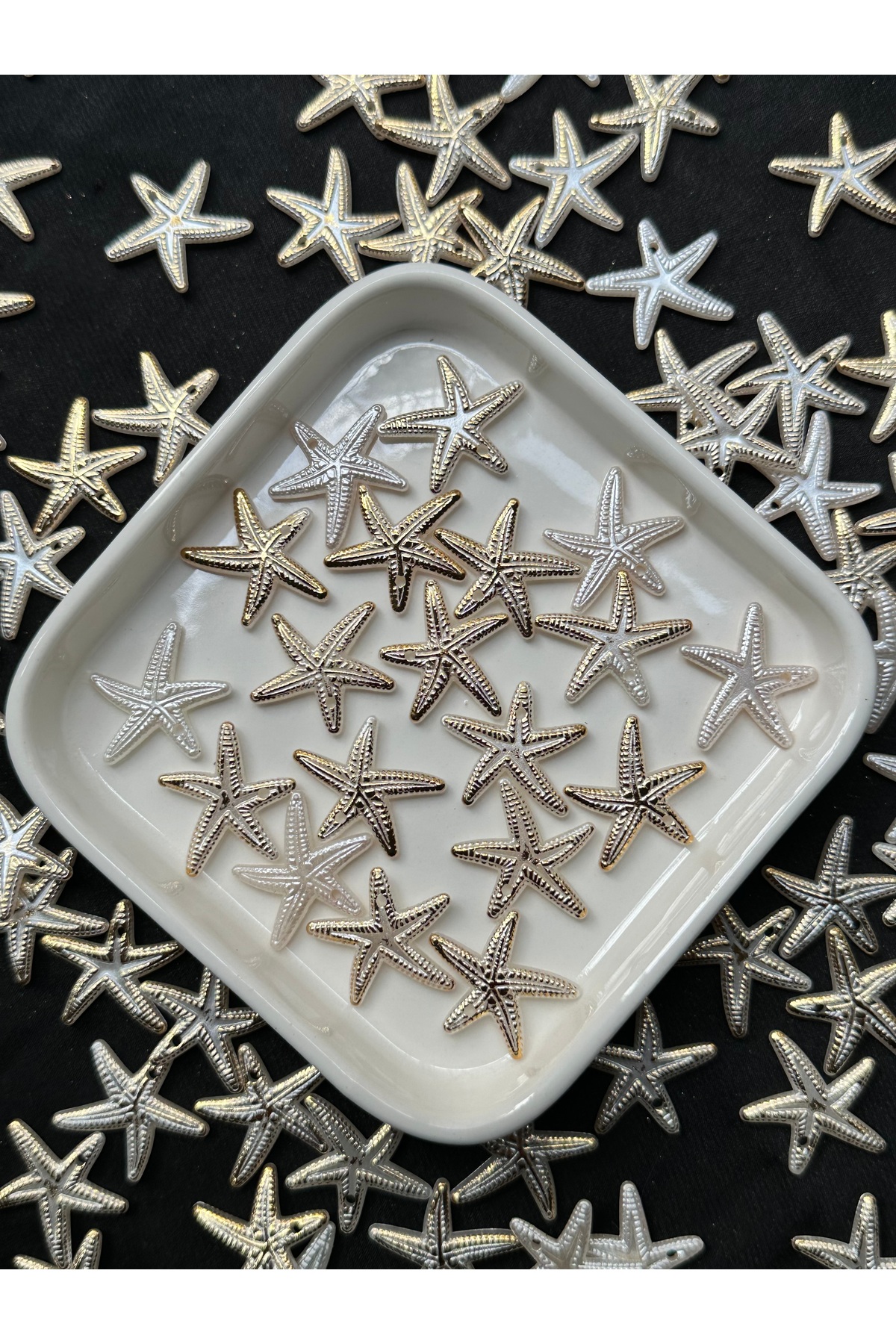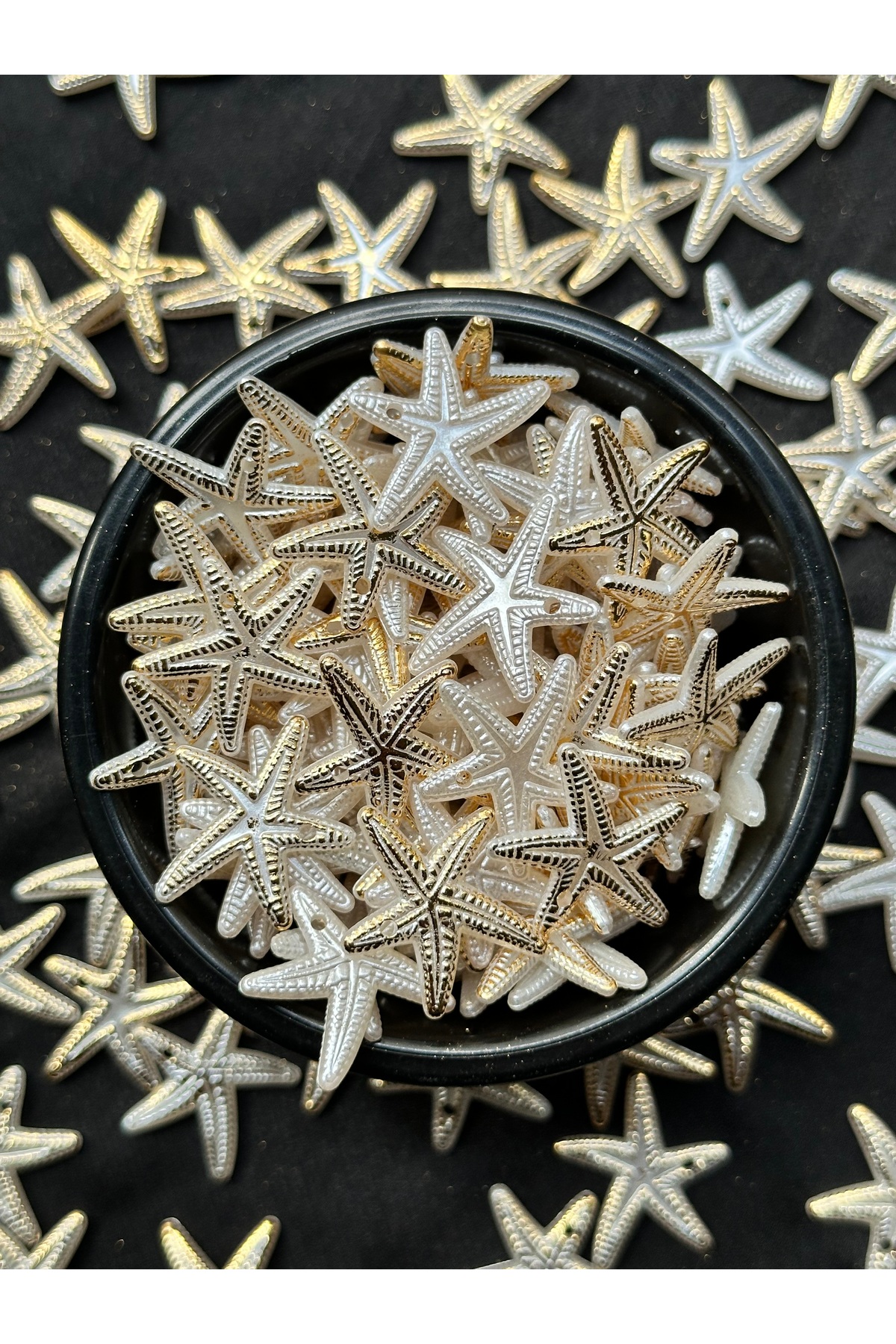 Takı yapımı ve hobi çalışmalarında kullanılmak üzere beyaz sedefli altın yaldız detaylı deniz yıldızı plastik boncuk.