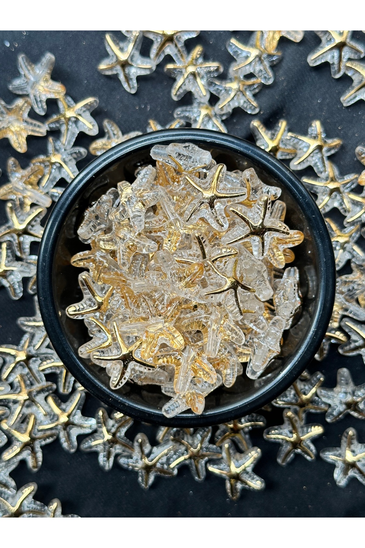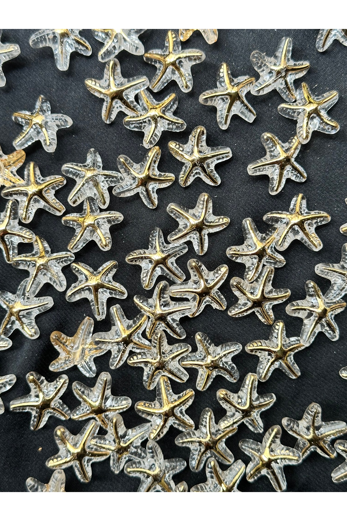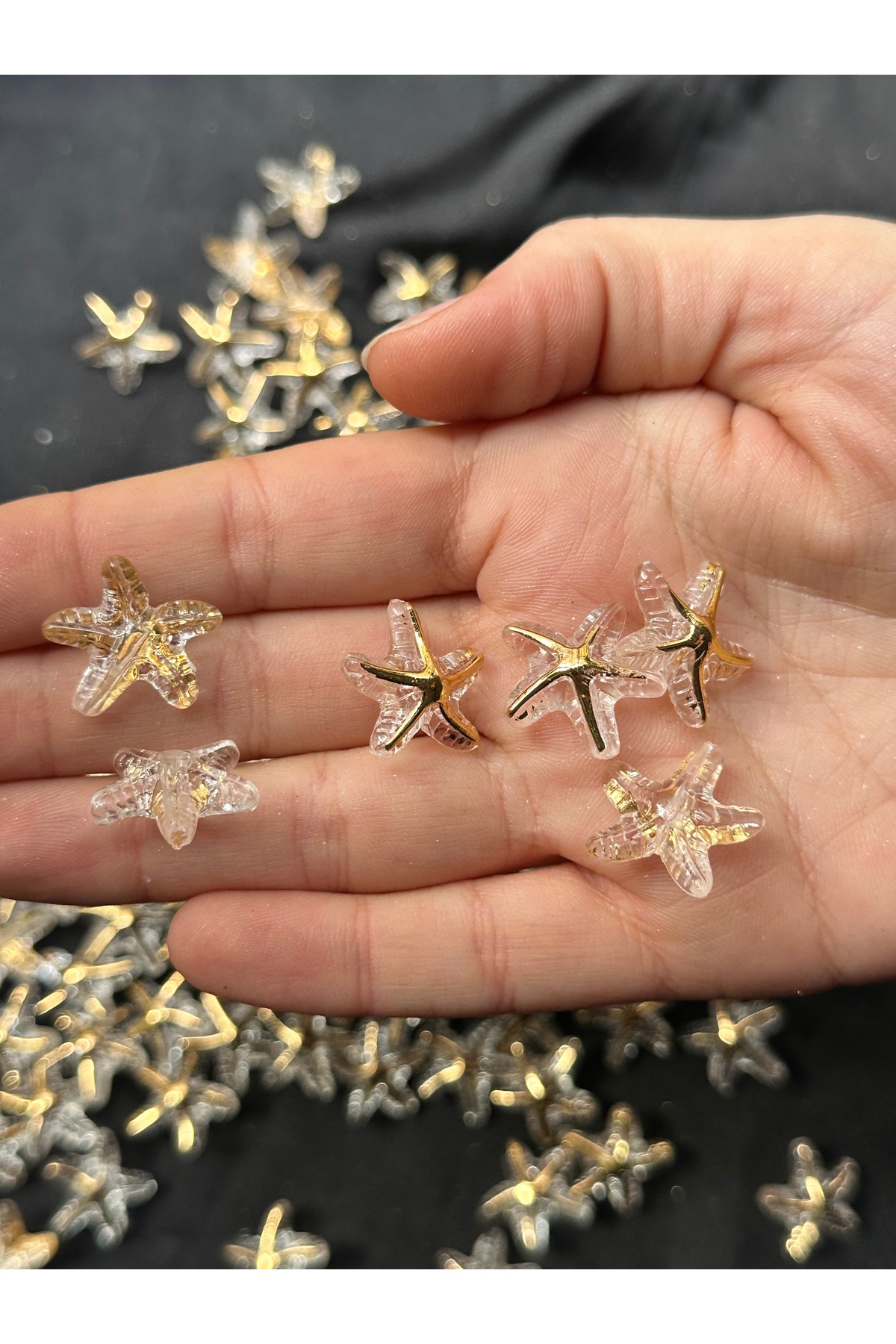 Takı yapımı ve hobi çalışmalarında kullanılmak üzere şeffaf altın yaldız detaylı deniz yıldızı plastik boncuk.