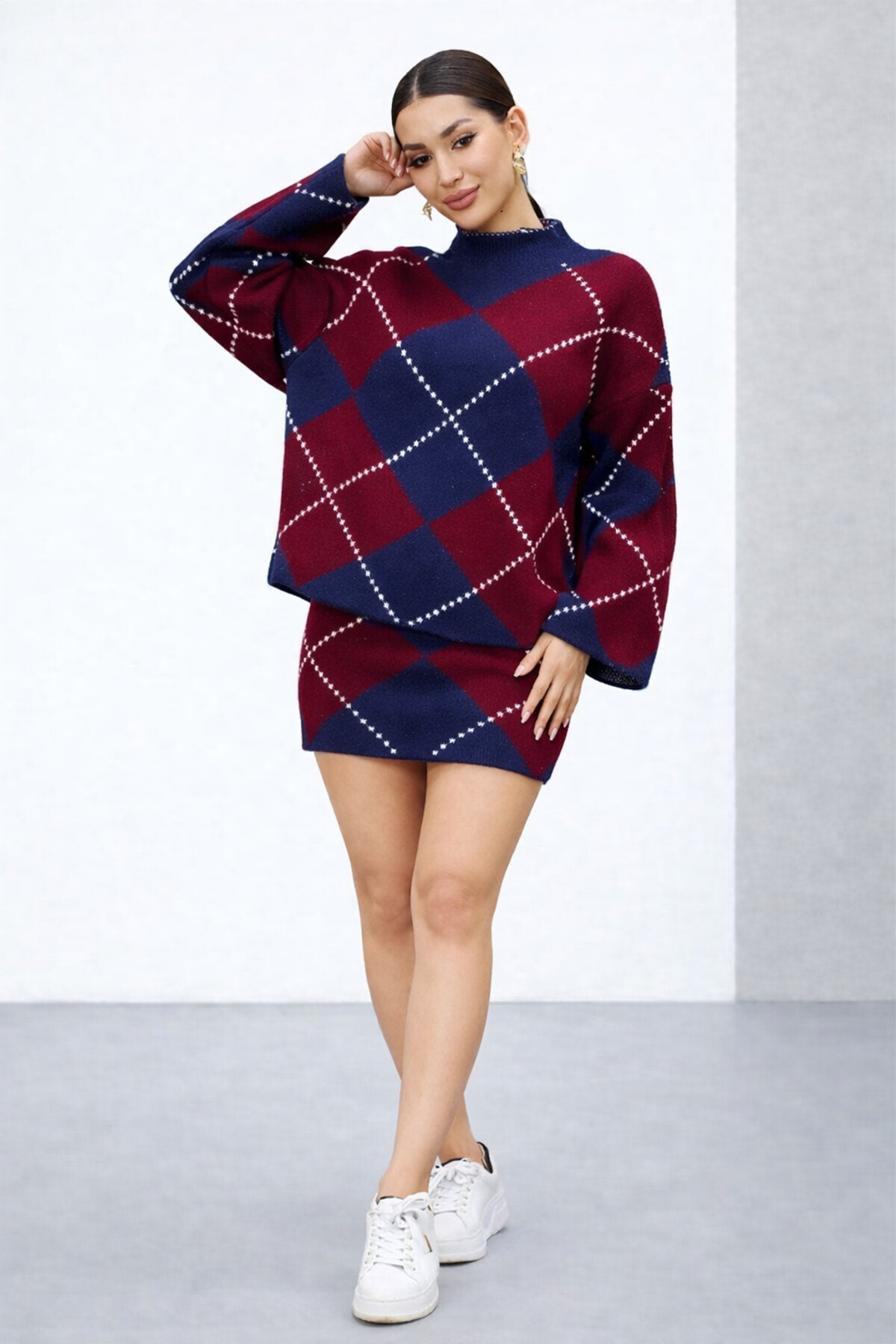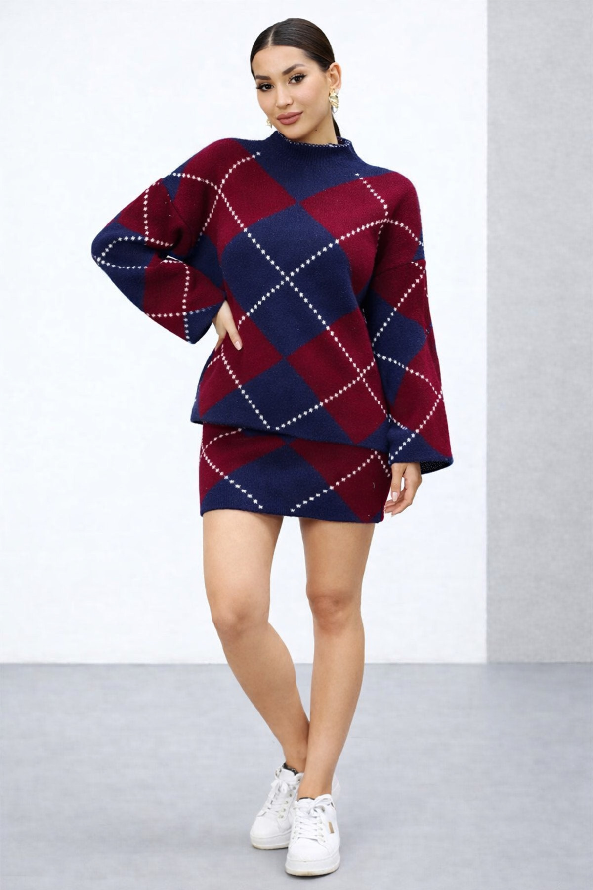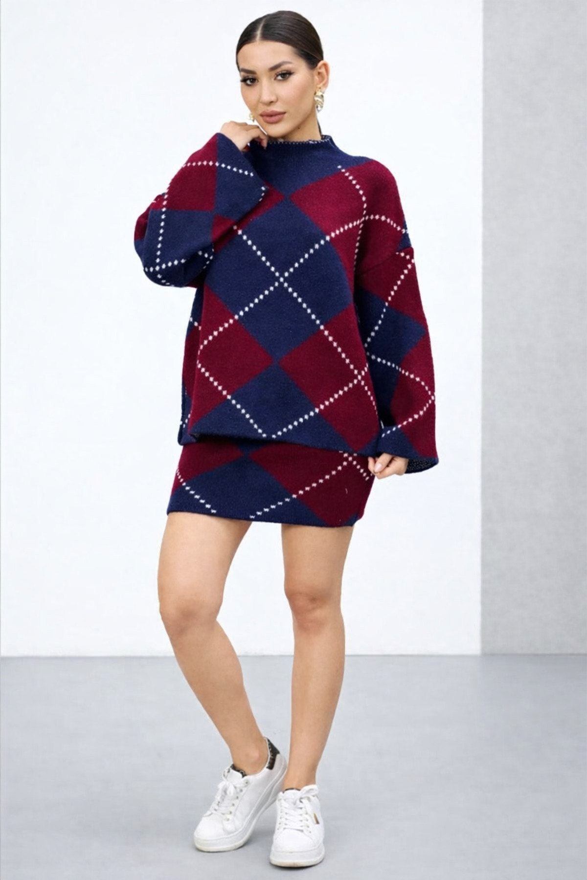 Oversize kesimli kazak ve mini etekten oluşan bu takım, hem birlikte hem de ayrı parçalar halinde kombinlenebilir.