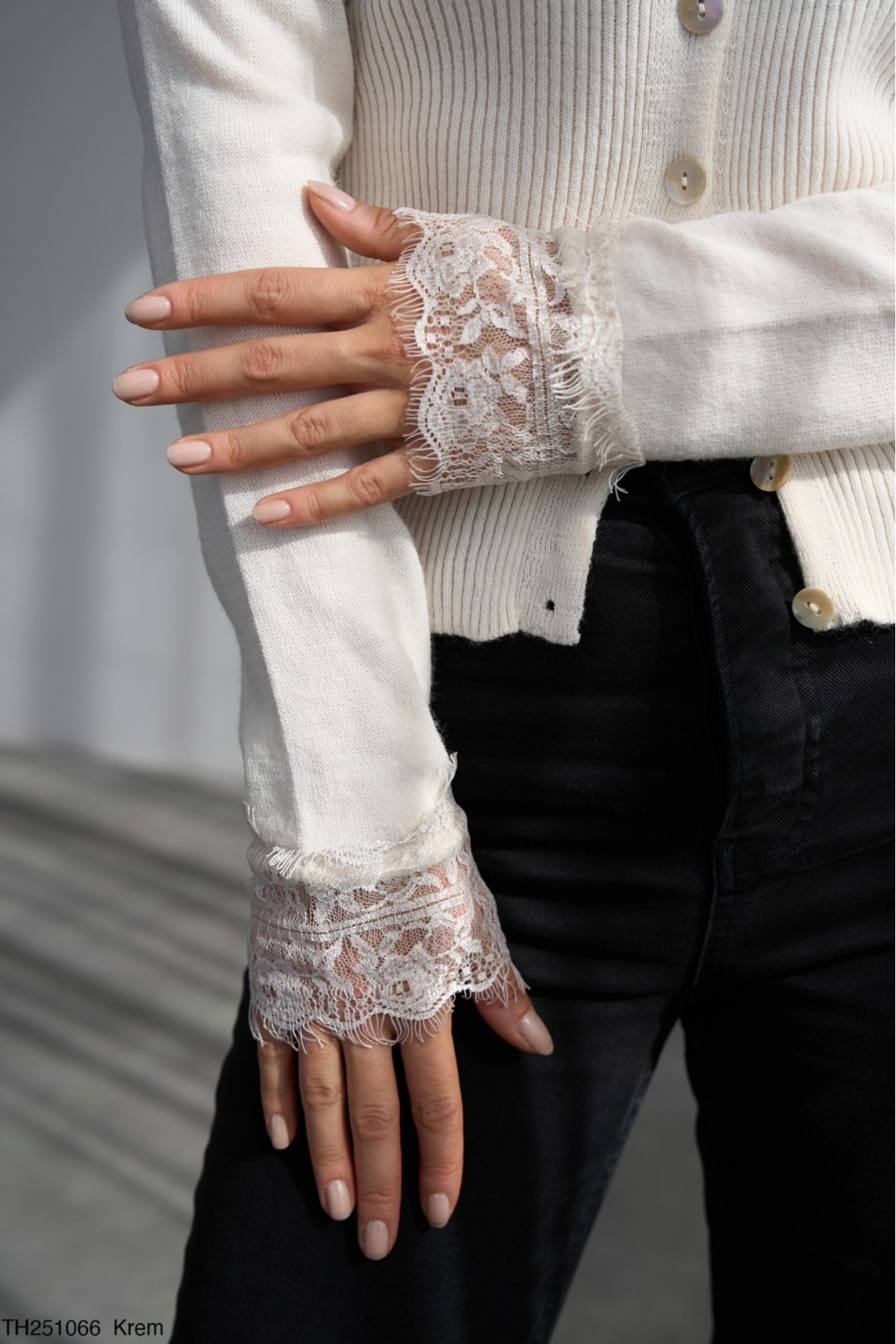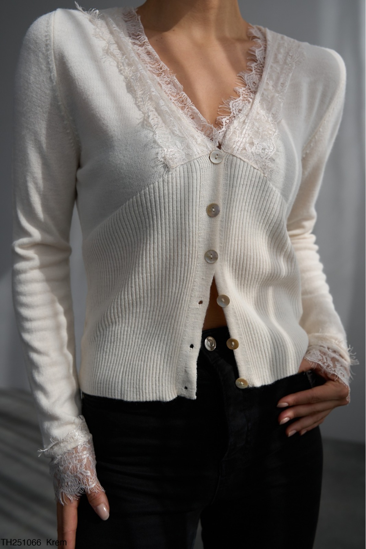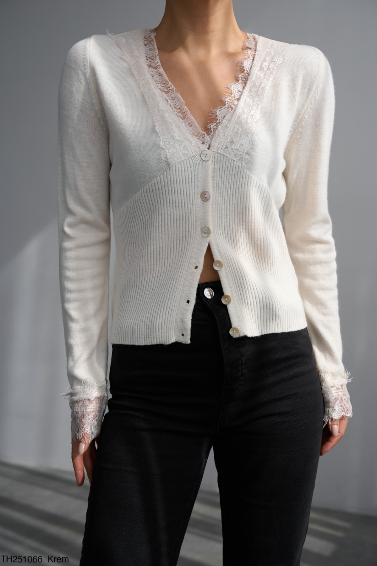 Kadın Siyah V Yaka Dantel Detaylı Hırka