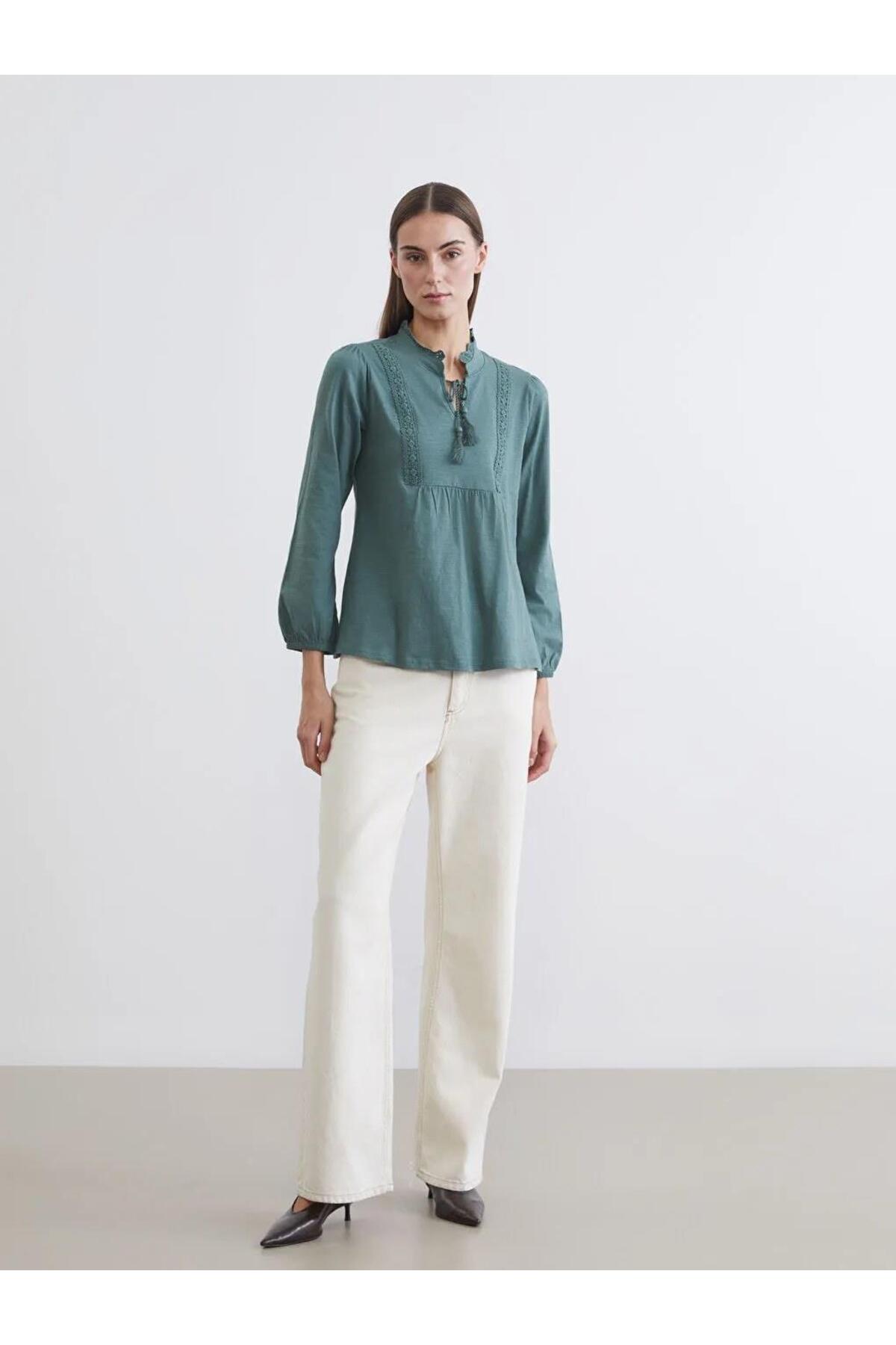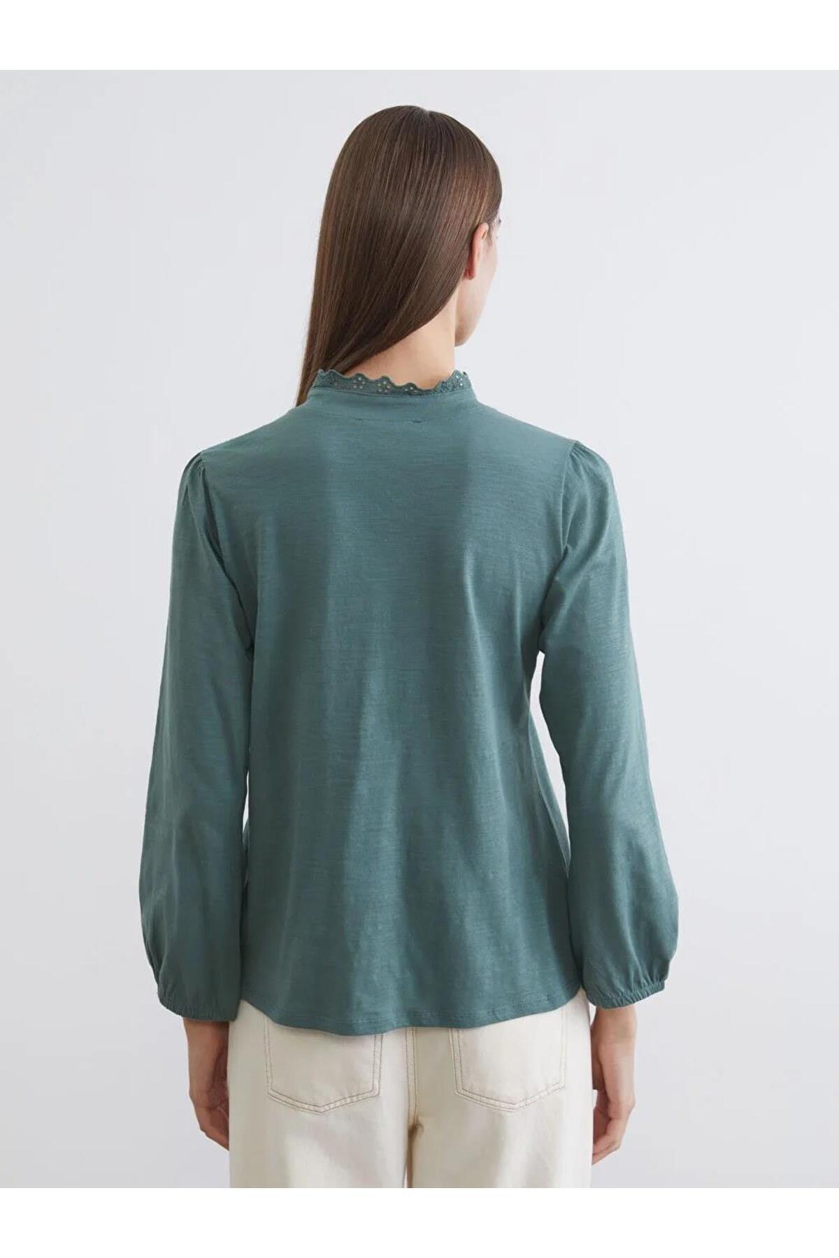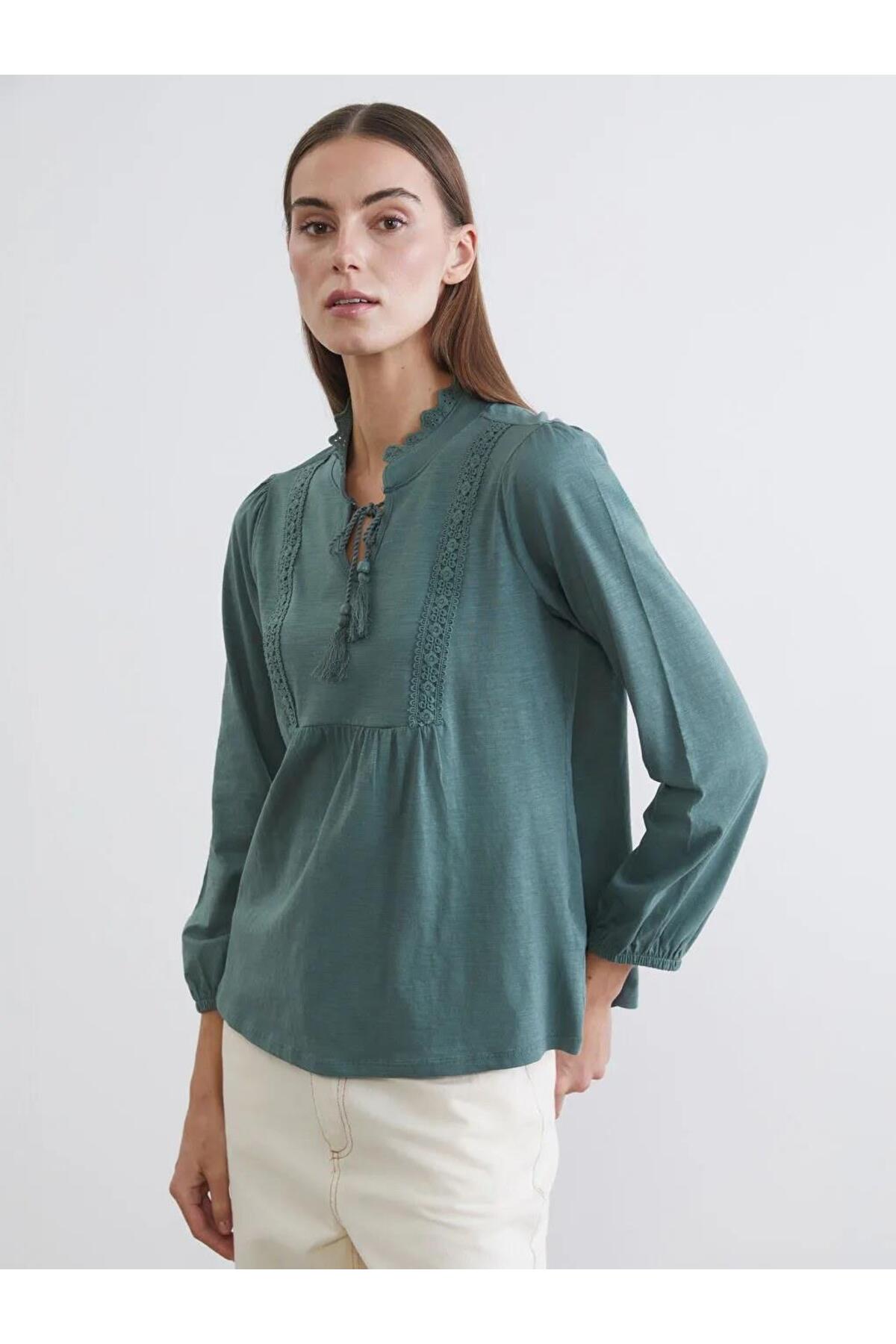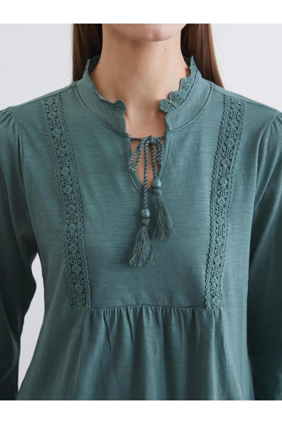 Yeşil Bağlamalı Yaka Nakışlı Büzgülü Bluz (S6)