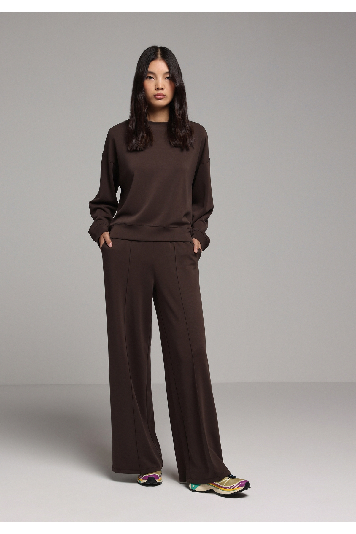 Cool ve rahat bir stil için kahverengi sweatshirt'ünü yüksek bel jeanlerle tamamla.