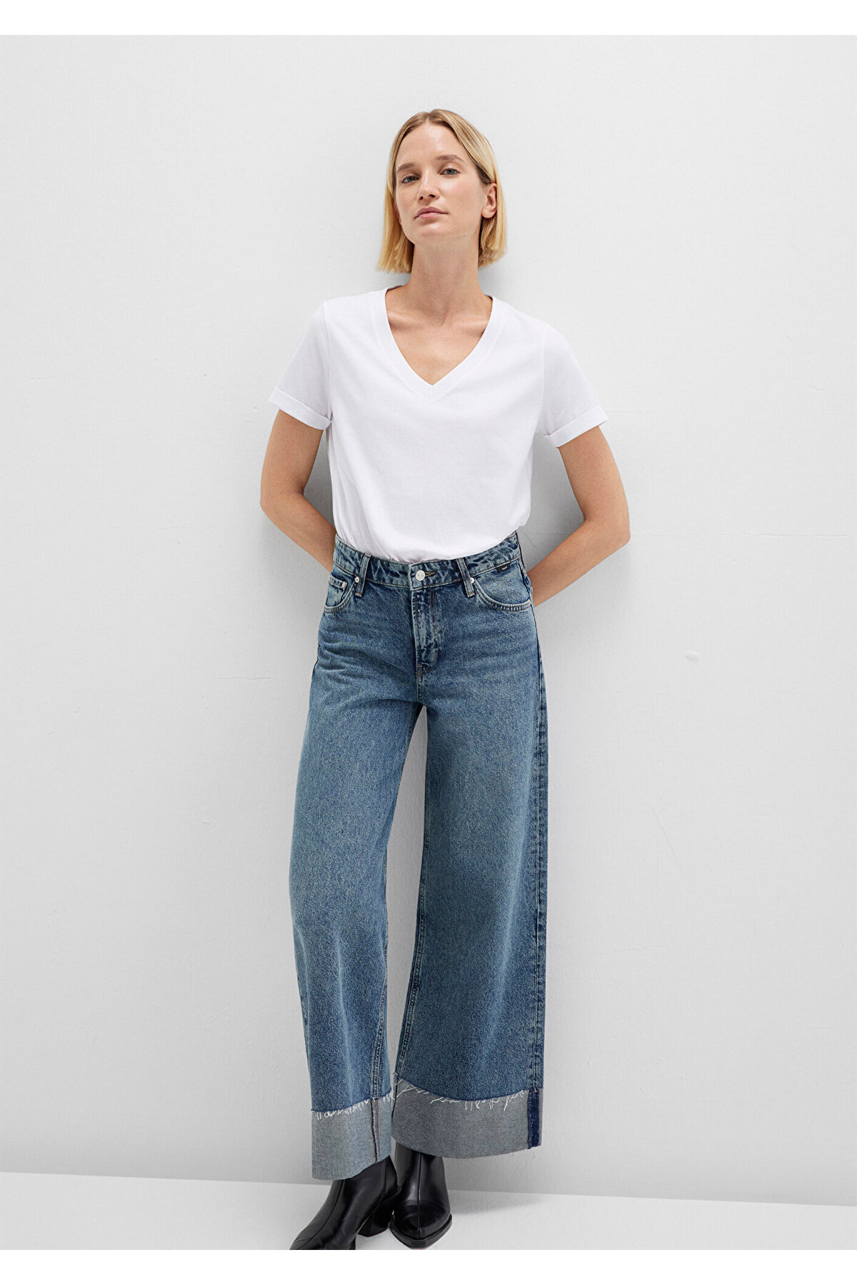 V Yaka Beyaz Basic Tişört, yüzde yüz pamuklu orta ağırlıkta kumaştan üretilmiştir.