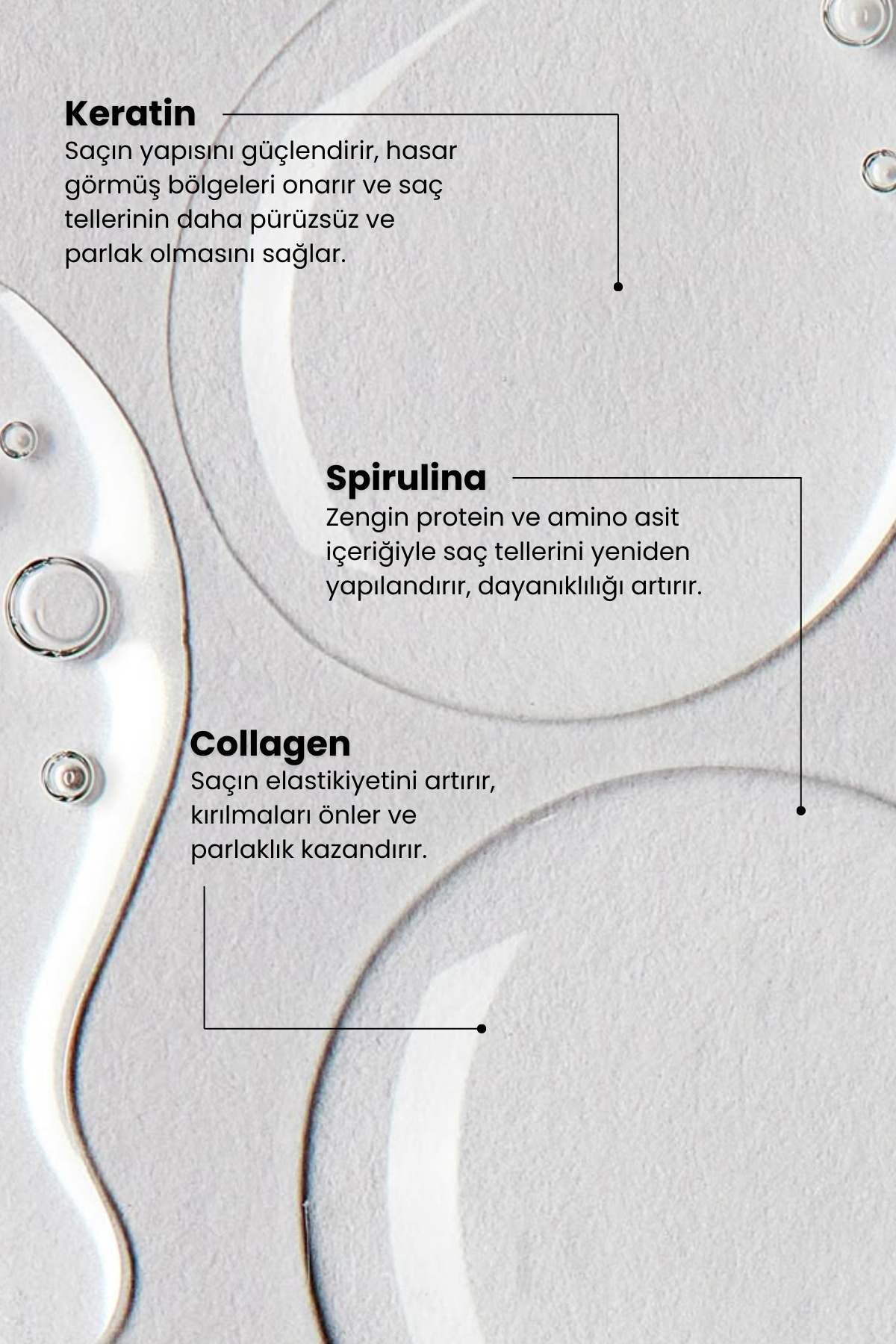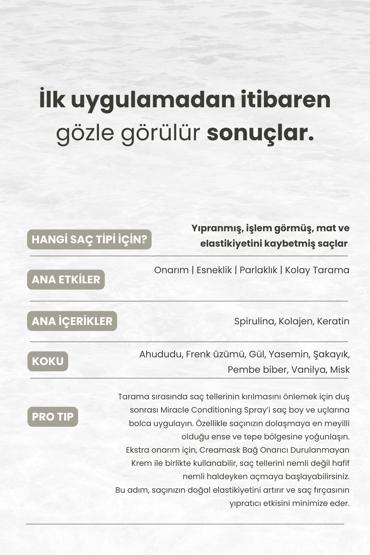Hafif ve nemlendirici yapısı, saç tellerindeki kırıkları onarırken, aynı zamanda elektriklenmeyi kontrol altına alarak saçların pürüzsüz ve düzenli bir görünüm kazanmasına yardımcı olur.