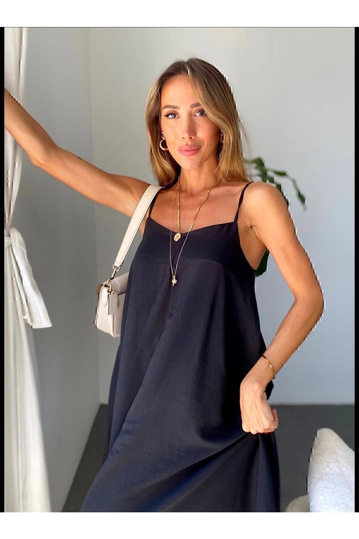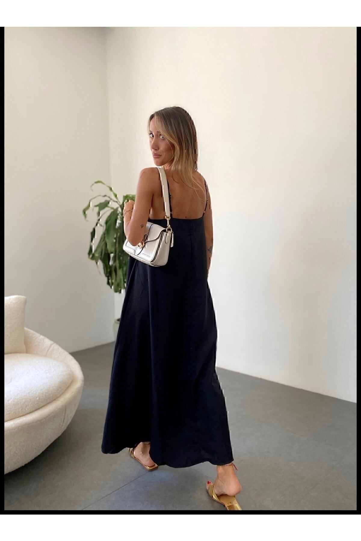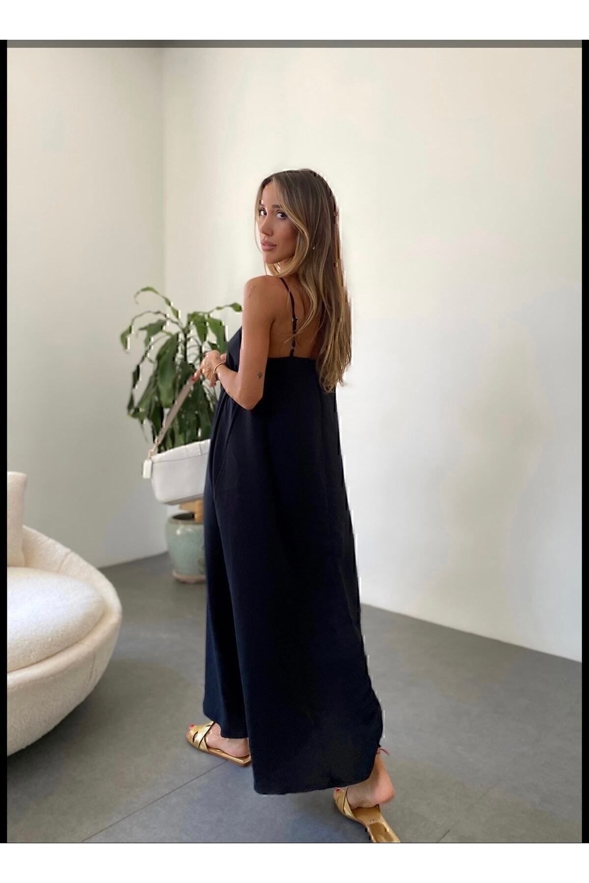 Ayrobin Kumaş Ayarlanabilir Askılı Uzun Siyah Elbise