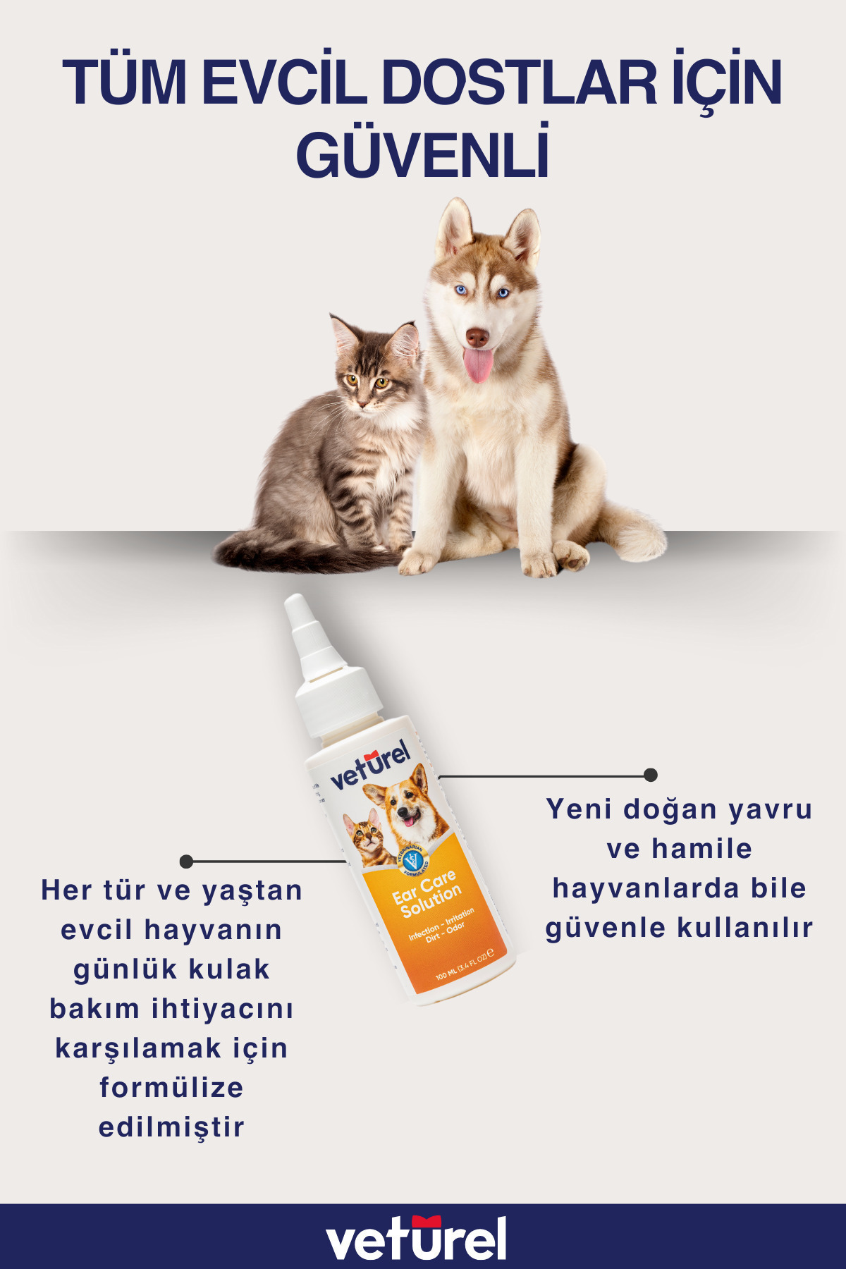 Tüm evcil hayvanların, günlük kulak bakım ihtiyacını Veturel Kulak Bakım Spreyi tek başına karşılar.