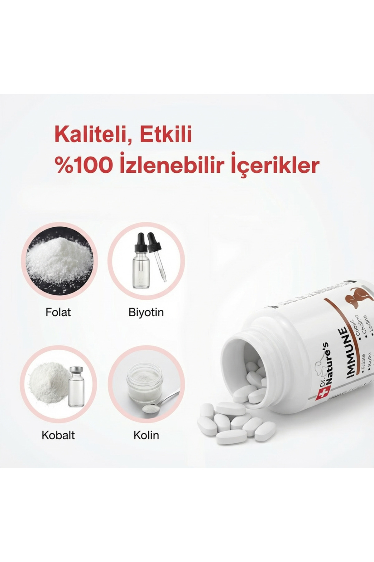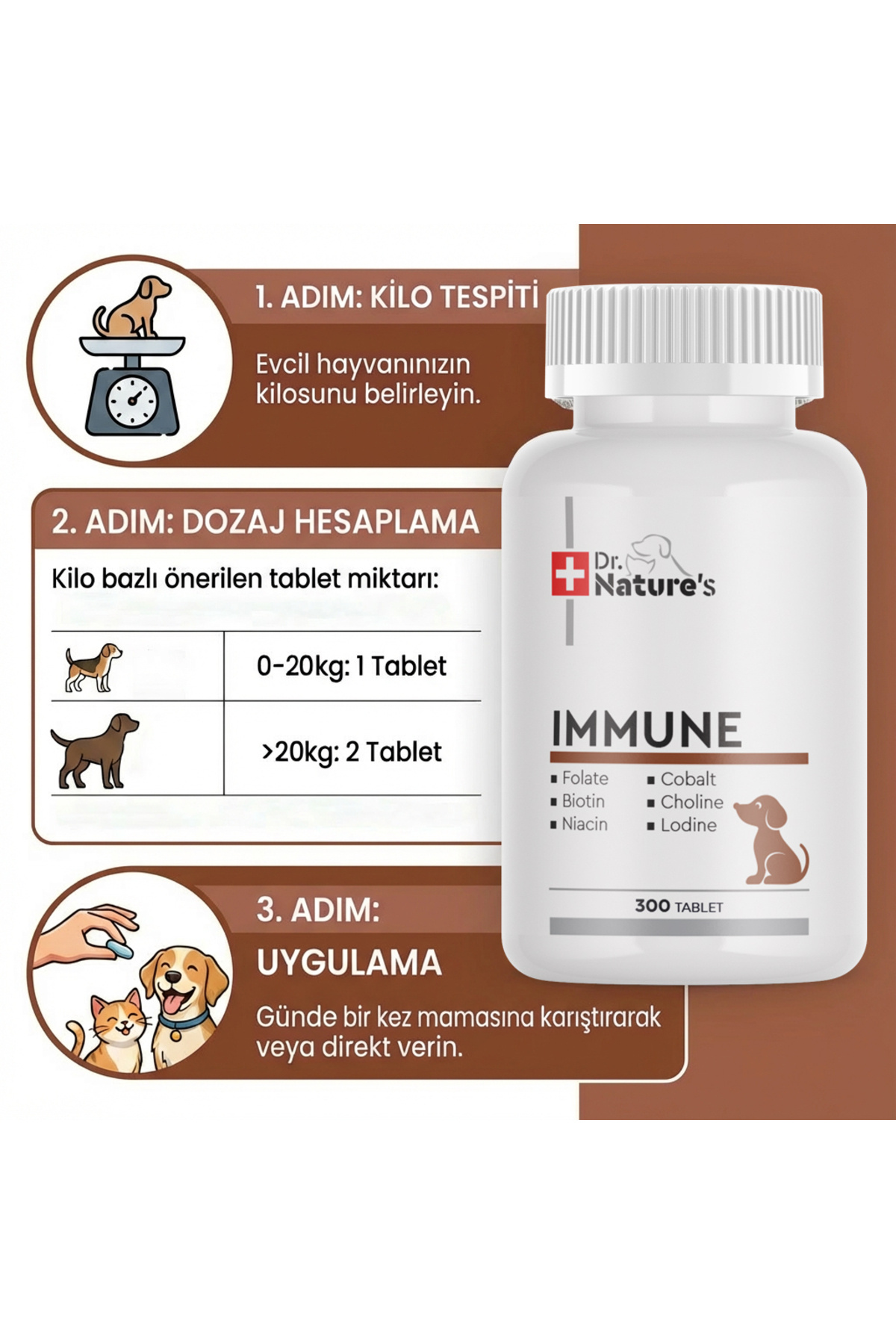 "- Bağışıklık sisteminin normal fonksiyonunu destekler - Sık hastalanan veya zayıf sahip köpeklerde günlük destek sağlar - Vitamin C ve E ile antioksidan koruma sunar - Demir ve Çinko içeriği ile bağışıklık hücre fonksiyonlarını destekler - Stres ve yoğun aktivite dönemlerinde vücut direncini korumaya yardımcı olur - Ameliyat ve hastalık sonrası toparlanma sürecinde destek sağlar - Yavru, yetişkin ve yaşlı köpeklerde günlük multivitamin desteği sunar - Tüm ırk köpekler için uygundur" 20 kg’a kadar günde 1 tablet, 20 kg üzeri için günde 2 tablet.