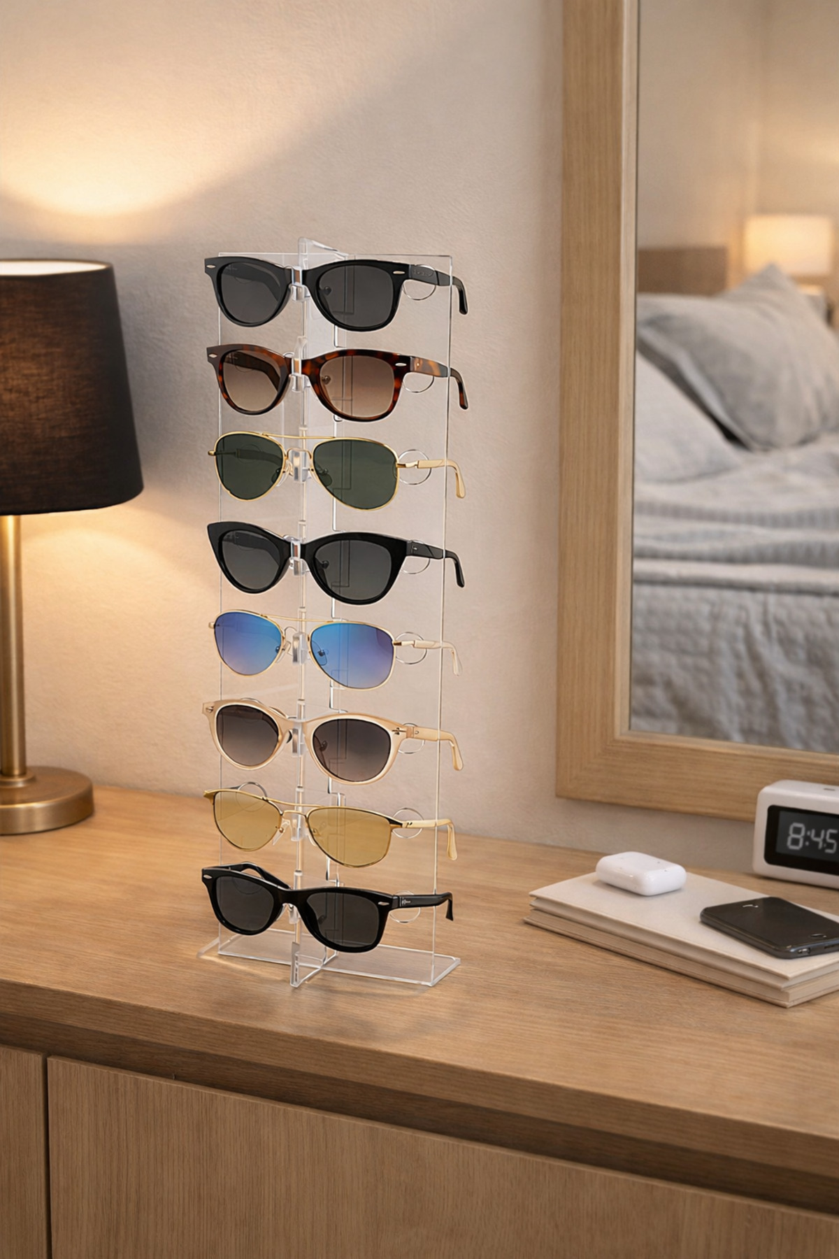 • ✔️ 8 adet gözlük kapasitesi • ✔️ Dayanıklı ve kaliteli şeffaf pleksi malzeme • ✔️ Vidasız, geçmeli ve kolay kurulum • ✔️ Masaüstü ve vitrin kullanımı için ideal • ✔️ Modern, sade ve şık tasarım • ✔️ Gözlük camlarına zarar vermez Ev, ofis, optik mağazaları ve vitrin kullanımı için uygundur.