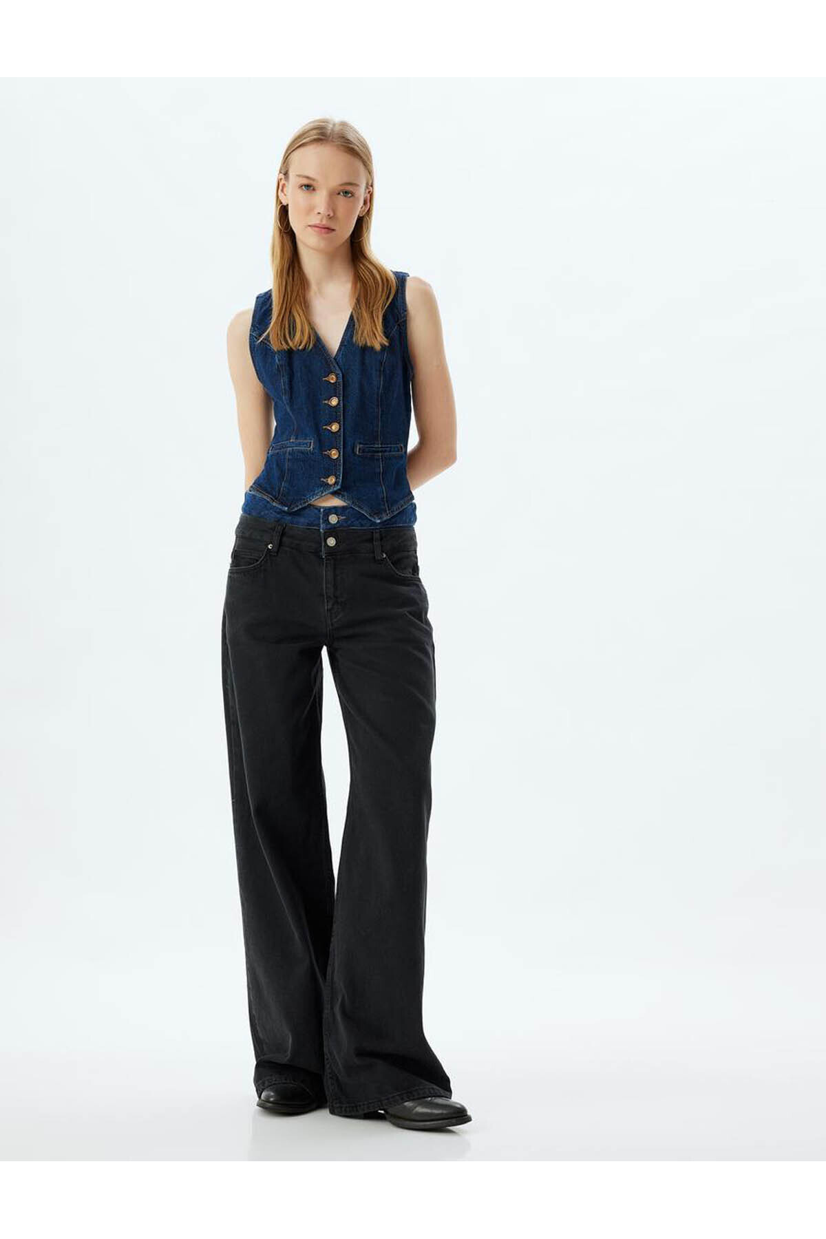 Bol Kesim Kot Pantolon Çift Bel Detaylı Düğmeli - Loose Straight Fit Jean