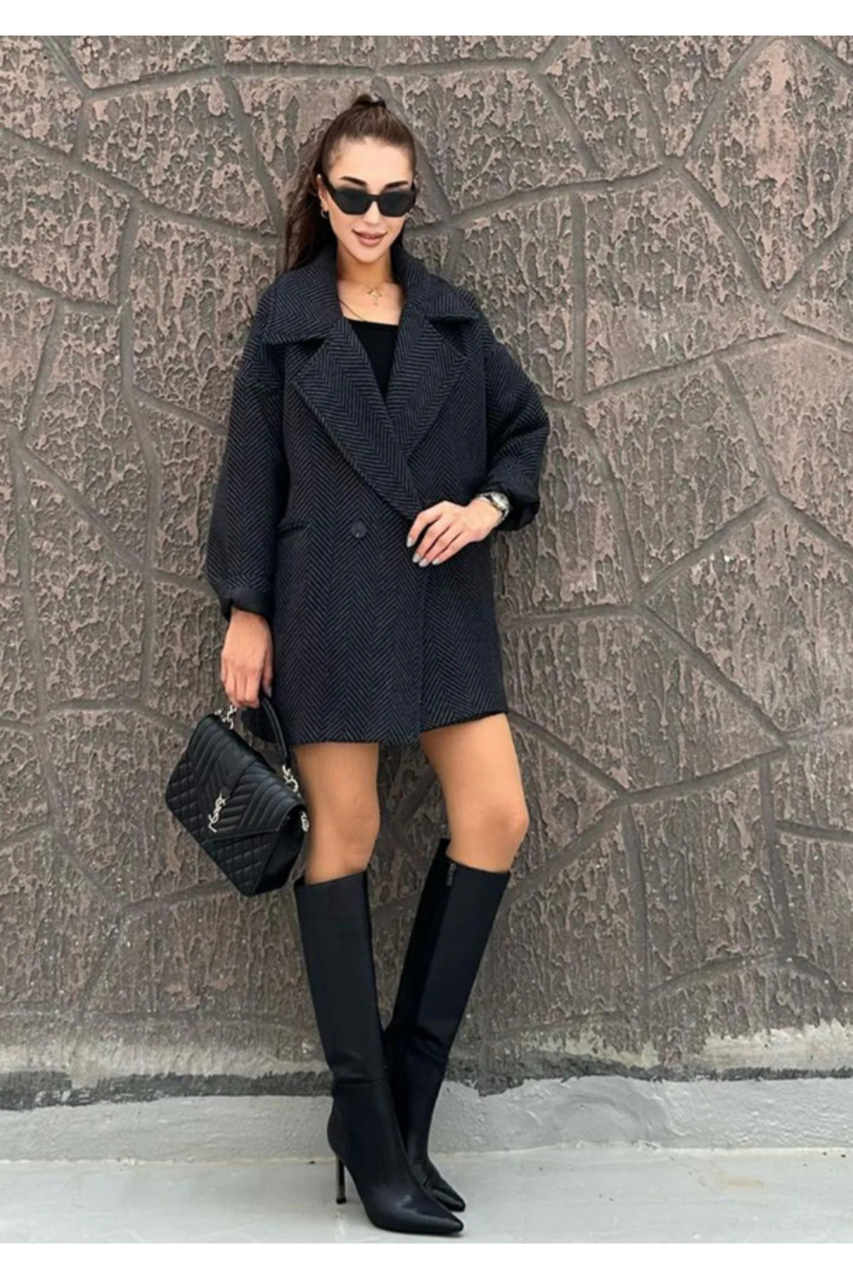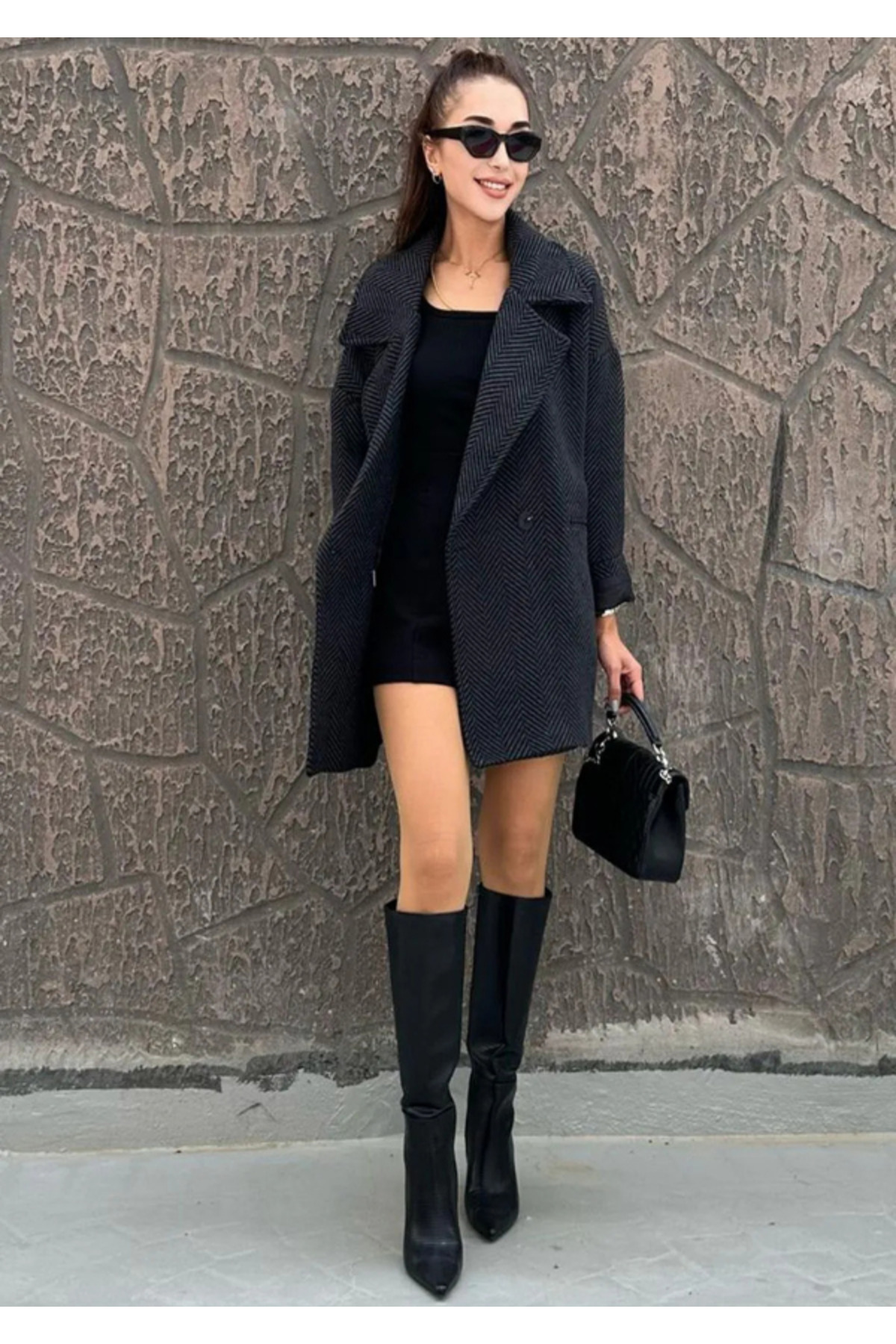 Kadın Antrasit Balıksırtı Desenli Astarlı Oversize Kaşe Kaban