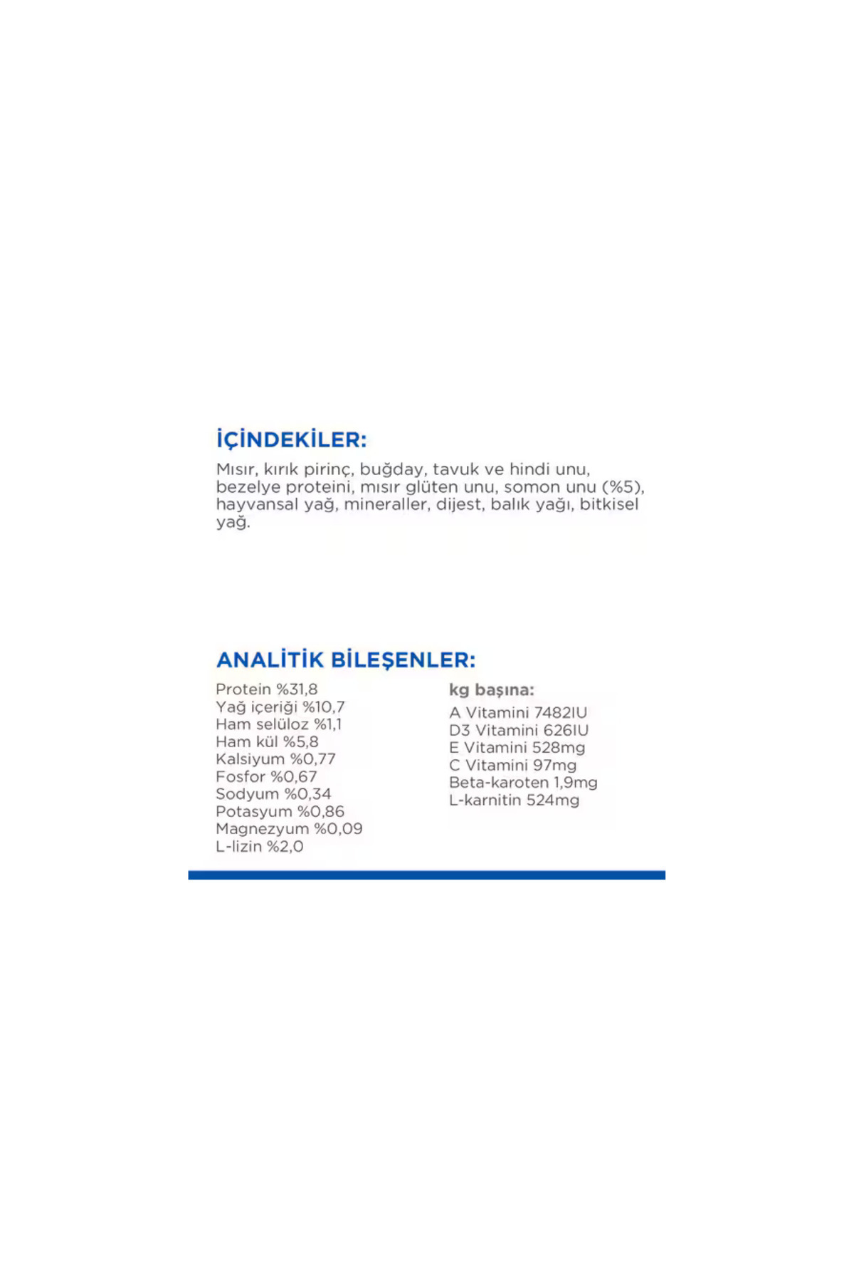 İçindekiler Mısır, Kırık Pirinç, Buğday, Tavuk ve Hindi Unu, Bezelye Proteini, Mısır Gluten Unu, Somon Unu, Hayvansal Yağ, Mineraller, Balık Yağı, Bitkisel Yağ.